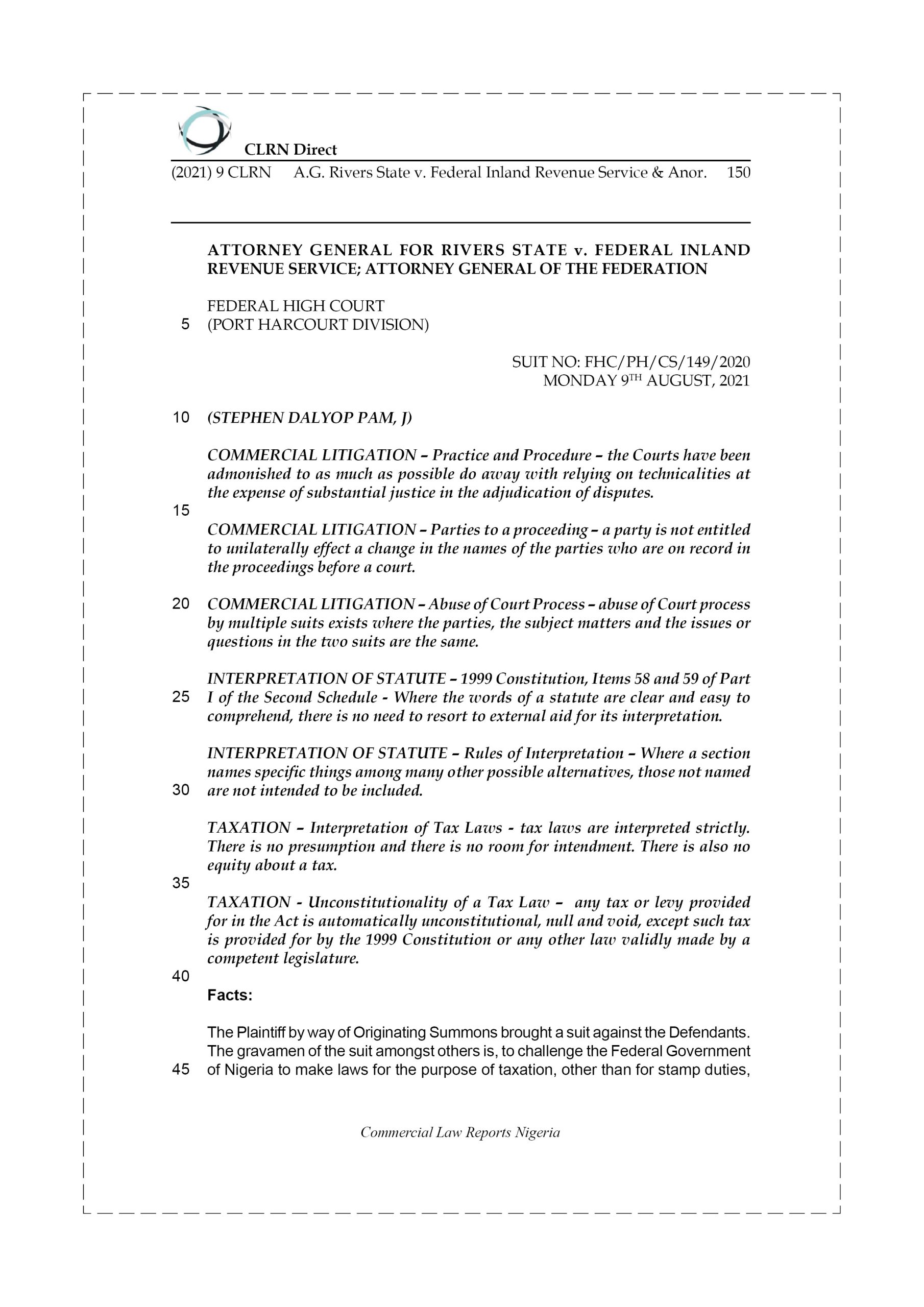 The Plaintiff by way of Originating Summons brought a suit against the Defendants. The gravamen of the suit amongst others is, to challenge the Federal Government of Nigeria to make laws for the purpose of taxation, other than for stamp duties, taxation of incomes, profit and capital gains, and the power of the FIRS to enforce and administer laws inconsistent with, or in excess of the powers of the Federal Government of Nigeria to make laws.