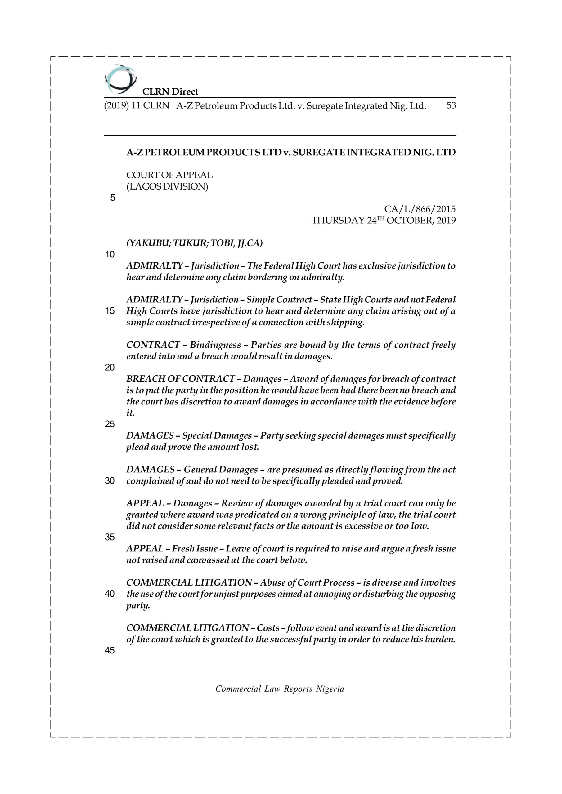The respondent entered into contract with the appellant wherein the latter was supposed to supply to the former Automotive Gas Oil (AGO) in separate tranches. In order to successfully carry out the transaction, the respondent secured bank guarantees. The appellant breached the contract by failing to carry out its contractual obligations. The respondent was aggrieved and filed a suit against the appellant at the High Court of Lagos State for damages. The respondent claimed the sum of N197,880,000.00 (One Hundred and Ninety Seven Million, Eight Hundred and Eighty Thousand Naira) being the loss of income from the first supply tranche of 5,000 metric tons of A.G.O which was to be supplied to a client for which it secured a bank guarantee of N535,440,000.00 (Five Hundred and Thirty Five Million, Four Hundred and Forty Thousand Naira). The respondent claimed the sum of N15,843,156.20k (Fifteen Million, Eight Hundred and Forty Three Thousand, One Hundred and Fifty Six Naira, Twenty Kobo) which was 18% interest on the bank guarantee for sixty days. Same amounts were also claimed for the second tranche of the AGO agreed but failed to be supplied by the appellant. Furthermore, the respondent claimed 21% interest on the sums from April, 2008 when the first tranche ought to have been supplied. The respondent also claimed general damages and costs.