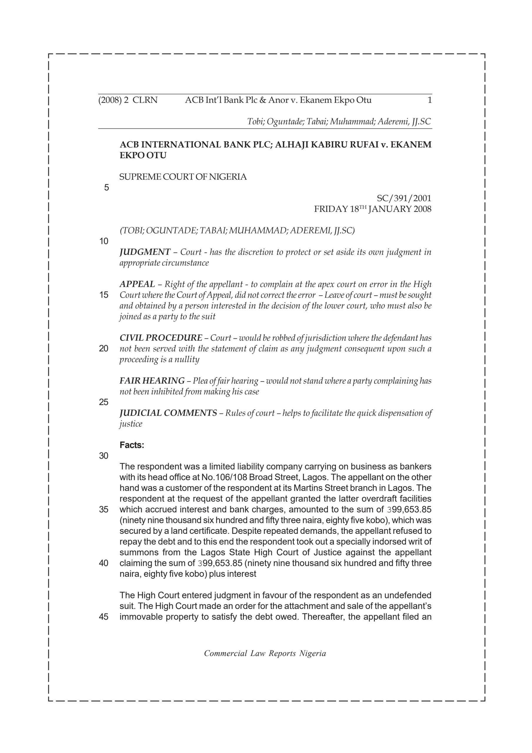 The respondent was a limited liability company carrying on business as bankers with its head office at No.106/108 Broad Street, Lagos. The appellant on the other hand was a customer of the respondent at its Martins Street branch in Lagos. The respondent at the request of the appellant granted the latter overdraft facilities which accrued interest and bank charges, amounted to the sum of N99,653.85 (ninety nine thousand six hundred and fifty three naira, eighty five kobo)