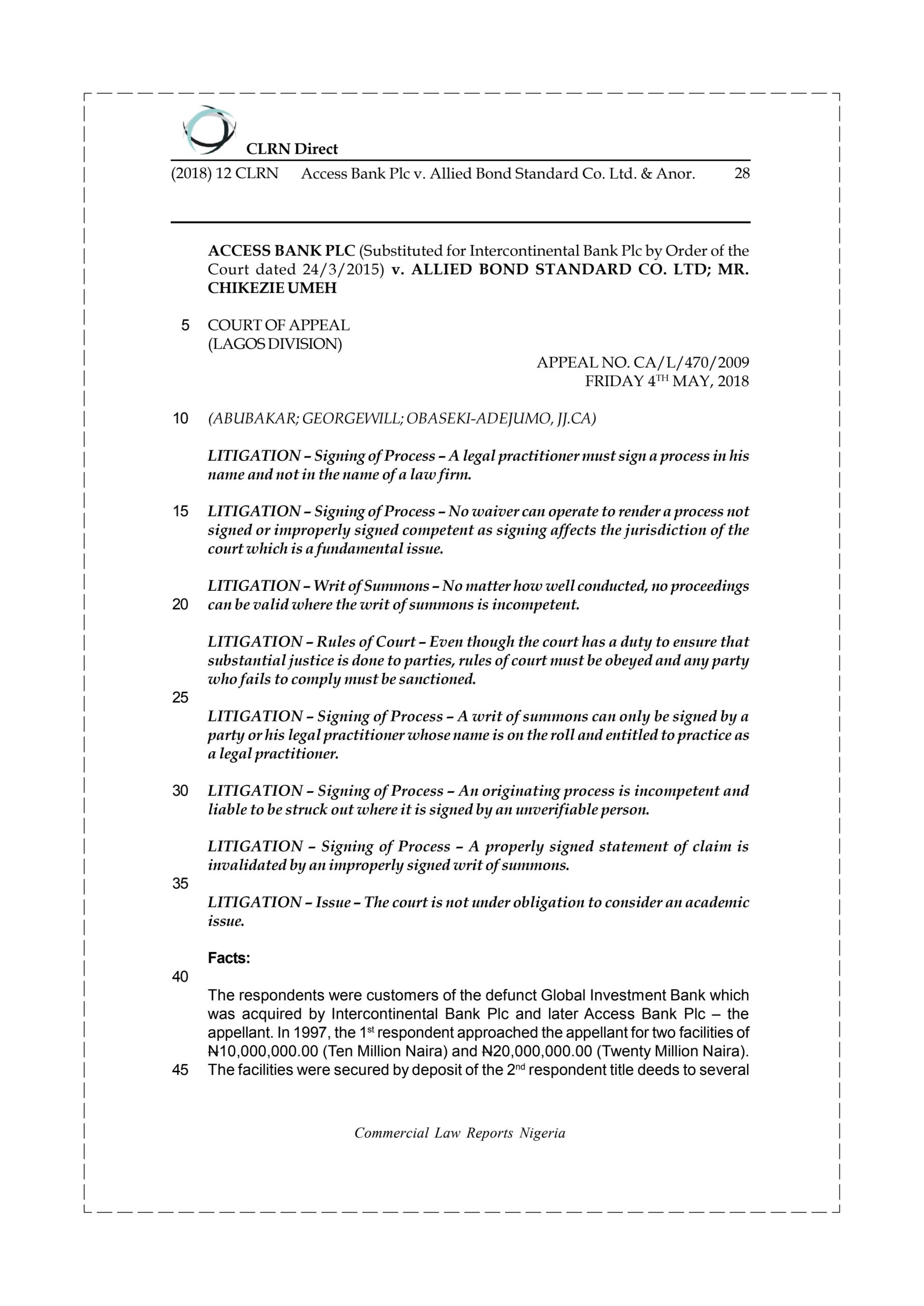 The respondents were customers of the defunct Global Investment Bank which was acquired by Intercontinental Bank Plc and later Access Bank Plc – the appellant. In 1997, the 1st respondent approached the appellant for two facilities of N10,000,000.00 (Ten Million Naira) and N20,000,000.00 (Twenty Million Naira). The facilities were secured by deposit of the 2nd respondent title deeds to several properties including one situate at Plot 59, Block 4, Lekki Peninsula Residential Scheme 1, Lagos State, covered by Certificate of Occupancy. By January 2000, the 1st respondent had repaid the sum of N26,517,700.00 (Twenty Six Million, Five Hundred and Seventeen Thousand, Seven Hundred Naira) in order to liquidate the facilities. A dispute arose between the parties as to the balance and the non reconciliation of the account in order to determine the true state of the 1st respondent’s indebtedness. In spite of this fact, the appellant threatened to sell the properties belonging to the 2nd respondent used as collateral for the facilities. The respondents became apprehensive and consequently, filed a suit against the appellant at the High Court of Lagos State to restrain it from selling the properties. One of the reliefs sought was a restraining order to prevent the appellant from selling the properties until after reconciliation of account and determination of the exact indebtedness.