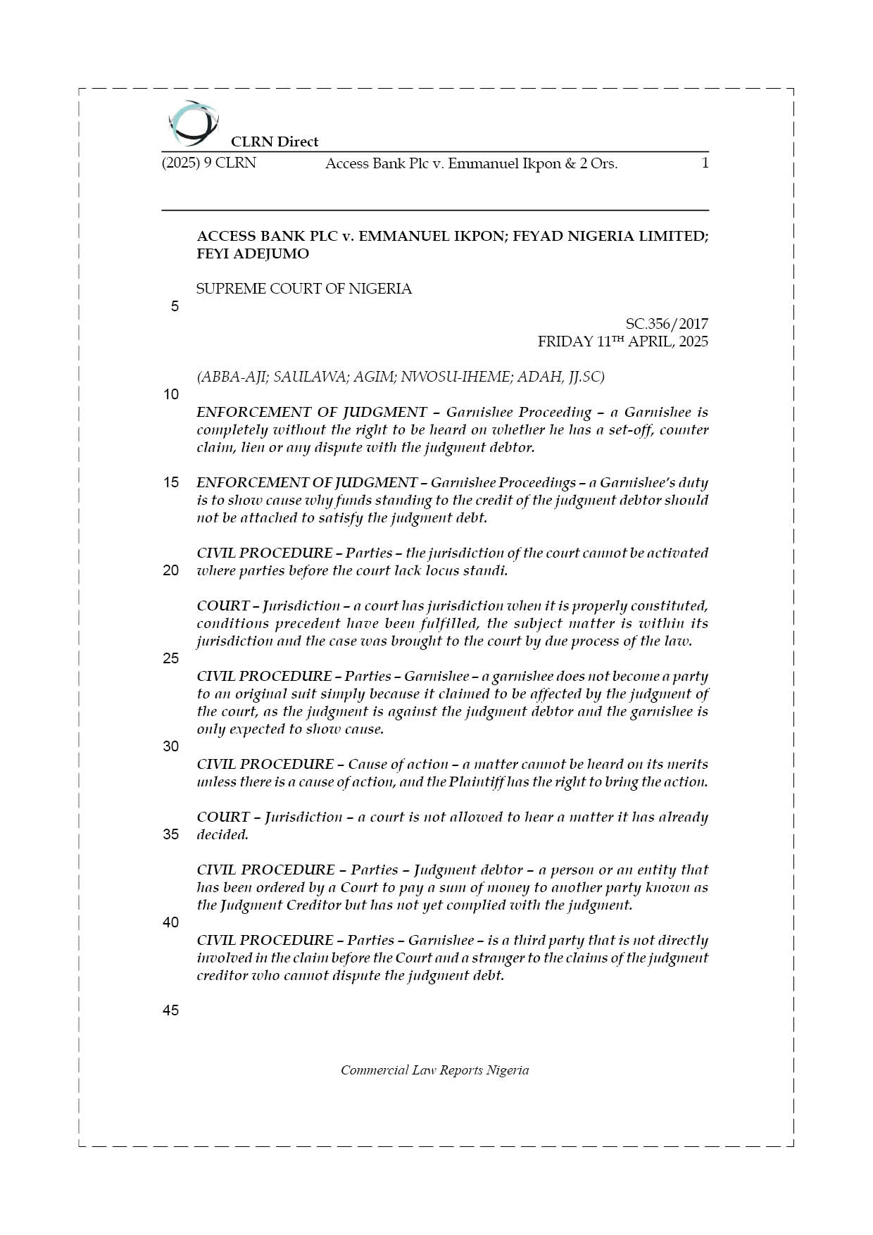 The 1st Respondent as Plaintiff sued the 2nd and 3rd Respondents as Defendants at the Federal High Court, Ikoyi, Lagos, for the recovery of the loan advanced to the 2nd and 3rd Respondents for the purchase and export of cocoa products. The trial Court assumed jurisdiction over the matter and on 16/3/2005, entered judgment in favour of the 1st Respondent for the sum of $440,000 against the 2nd and 3rd Respondents. In execution of the judgment, the trial Court issued a Garnishee Order Nisi against the Appellant attaching the funds in the account of the 2nd Respondent with the Appellant, who was indebted to the Appellant to the tune of about N30 million. However, the 2nd Respondent’s account with the Appellant was frozen since 2003, even before the suit was instituted, following criminal investigation against the 2nd Respondent and its Managing Director. The trial Court made the Order Nisi absolute and further issued Writ of Execution against the Appellant. Based on the Writ of Execution, the 1st Respondent attempted to execute the Garnishee Order absolute against the Appellant, who discovered that the substantive suit over which the trial Court assumed jurisdiction and entered judgment falls outside the jurisdiction of the Federal High Court by virtue of Section 251 of the Constitution of the Federal Republic of Nigeria, 1999, as amended, and as such, a nullity. As a person affected by a judgment that is a nullity, the Appellant’s application for the trial Court to set aside the judgment that was given without jurisdiction, was struck out. He appealed to the lower Court, which dismissed same, hence this appeal.
