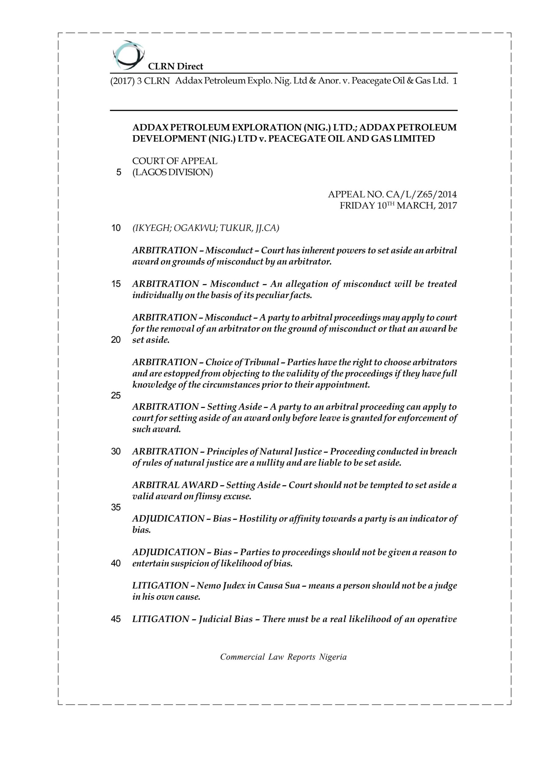 The court found in favour of the respondent and held that the arbitrator was in breach of the principles of nemo judex in causa sua and that the entire proceedings were invalid and therefore, set aside the entire award. The appellant was aggrieved and filed a notice of appeal at the Court of Appeal, Lagos Division challenging the decision of the court.