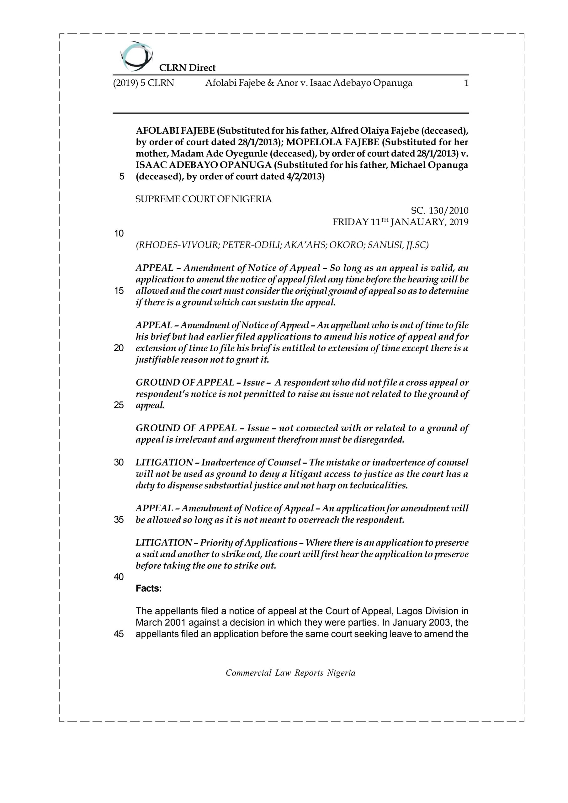 The appellants filed a notice of appeal at the Court of Appeal, Lagos Division in March 2001 against a decision in which they were parties. In January 2003, the appellants filed an application before the same court seeking leave to amend the notice of appeal, leave to raise a new issue proposed in the amended notice of appeal, leave to file additional grounds of appeal and extension of time within which to file their brief of argument. In January, 2008 the court heard the application and in its ruling, dismissed it alongside the appeal. In dismissing the application and the appeal, the court relied on the fact that the appellants were out of time in filing their brief of argument. The appellants were dissatisfied and filed a notice of appeal at the Supreme Court of Nigeria for an order of the court to overrule the ruling of the Court of Appeal and allow the prayers in their application.