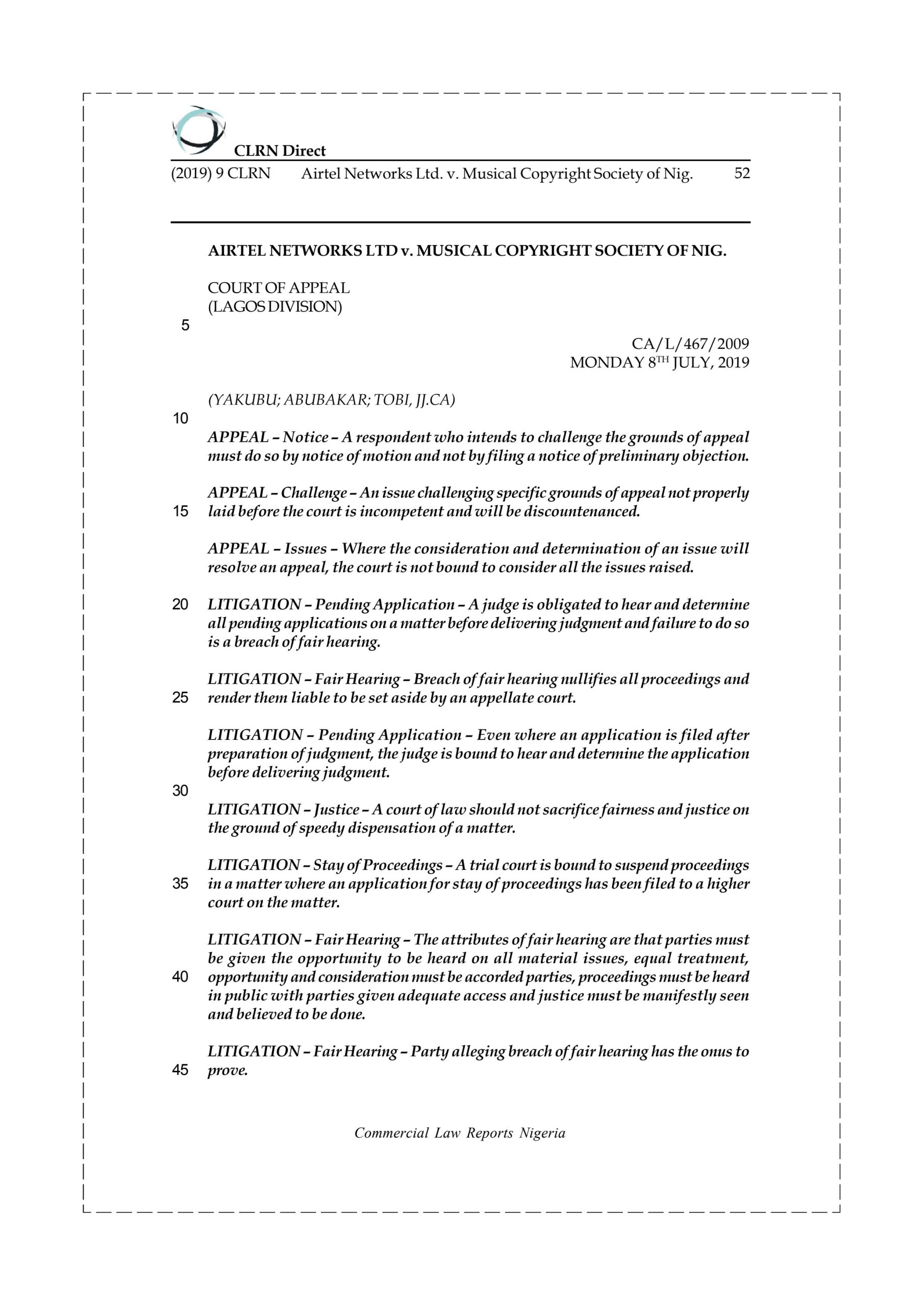 The application was refused and the appellant filed an appeal at the Court of Appeal, Lagos Division. It also filed a stay of proceedings at the trial court. The trial court heard the application but refused to grant it. Same application was filed at the Court of Appeal. The trial court continued with the matter and on close to delivering its judgment on the suit when the appellant filed another application before the court for further stay of proceedings. The court refused to hear the application and without waiting for the Court of Appeal to hear and determine the appellant’s application for stay of proceedings, delivered its judgment and awarded the sum of N100,000.000.00 (One Hundred Million Naira) in favour of the respondent as special and general damages for the infringement of its copyright by the appellant. The appellant was dissatisfied with the judgment of the trial court and as a result filed a notice of appeal at the Court of Appeal, Lagos Division urging it to reverse the trial court.