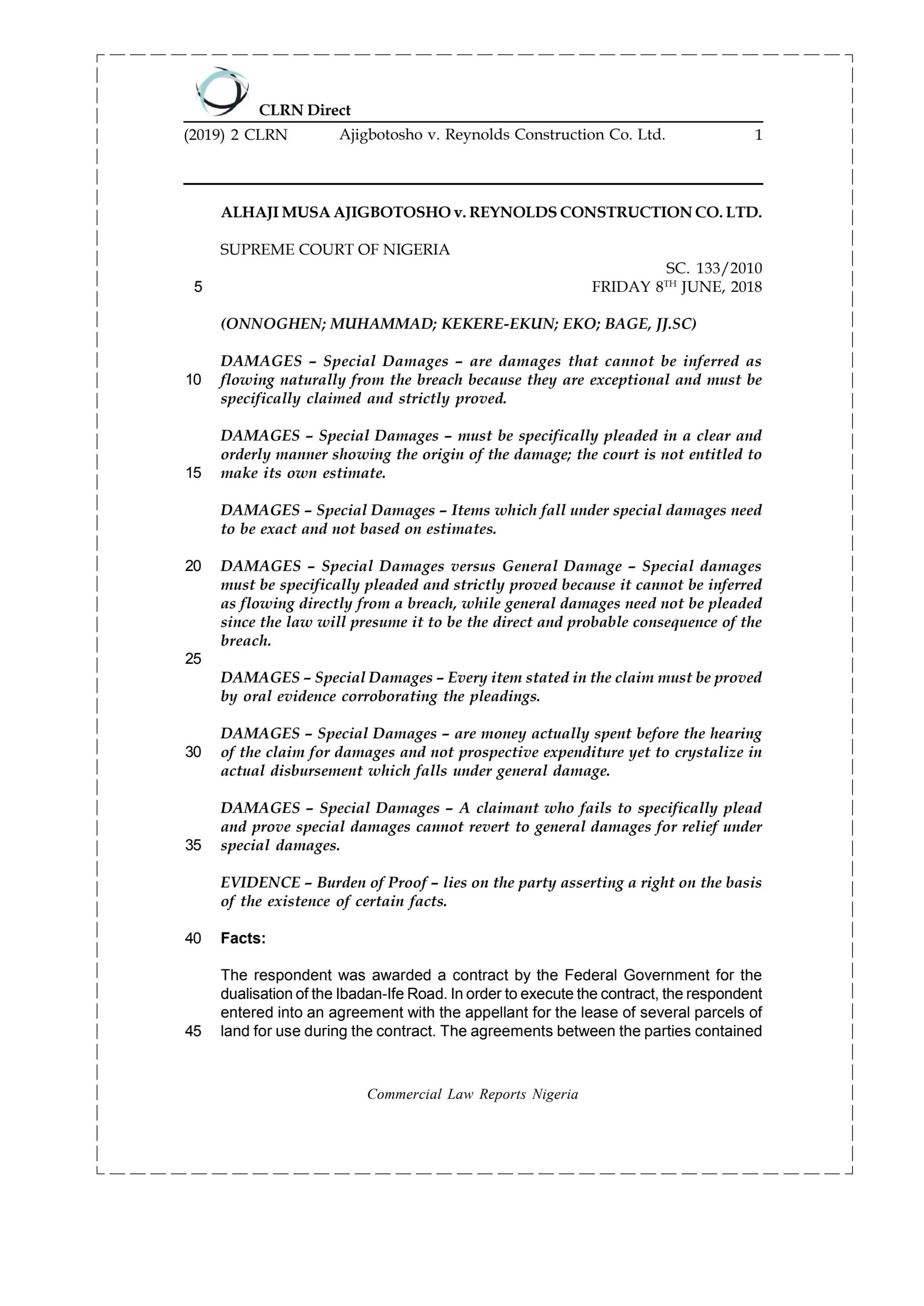 After completing the project, the appellant approached the respondent to fulfil the covenant in the agreement but the latter declined. After repeated demands to no avail, the appellant filed a suit against the respondent at the High Court of Oyo State, Ibadan Division claiming breach of contract as well as special and general damages. The appellant claimed the sum of N743,149.20 (Seven Hundred and Forty Three Thousand, One Hundred and Forty Nine Naira, Twenty Kobo) as cost of repair of road damage and another sum of N3,712,500.00 (Three Million, Seven Hundred and Twelve Thousand, Five Hundred Naira) being the amount required to rehabilitate the damaged parcels of land and a further N25,000.00 (Twenty Five Thousand Naira) as cost of the survey. All these claims were made under special damages. The appellant also sought general damages in the sum of N1,000,000.00 (One Million Naira).