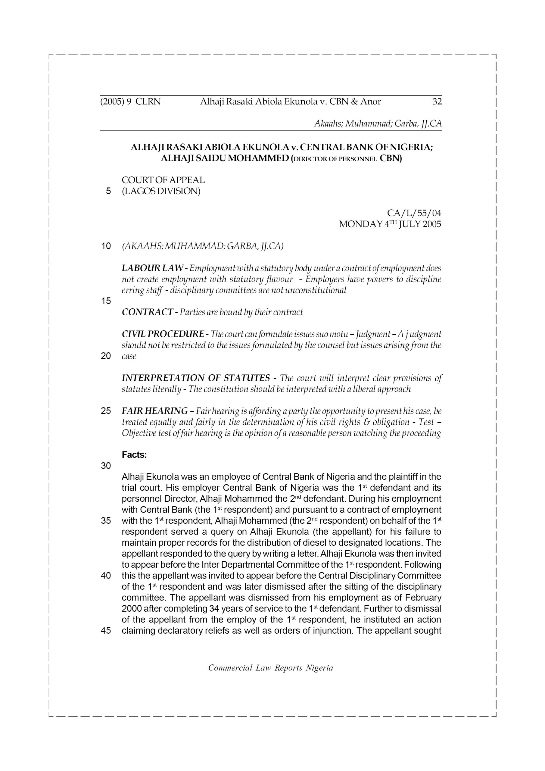 Alhaji Ekunola was an employee of Central Bank of Nigeria and the plaintiff in the trial court. His employer Central Bank of Nigeria was the 1st defendant and its personnel Director, Alhaji Mohammed the 2nd defendant. During his employment with Central Bank (the 1st respondent) and pursuant to a contract of employment with the 1st respondent, Alhaji Mohammed (the 2nd respondent) on behalf of the 1st respondent served a query on Alhaji Ekunola (the appellant) for his failure to maintain proper records for the distribution of diesel to designated locations. The appellant responded to the query by writing a letter. Alhaji Ekunola was then invited to appear before the Inter Departmental Committee of the 1st respondent. Following this the appellant was invited to appear before the Central Disciplinary Committee of the 1st respondent and was later dismissed after the sitting of the disciplinary committee. The appellant was dismissed from his employment as of February 2000 after completing 34 years of service to the 1st defendant. Further to dismissal of the appellant from the employ of the 1st respondent, he instituted an action claiming declaratory reliefs as well as orders of injunction. The appellant sought reinstatement to the employ of the 1st respondent as well as restraining orders of injunctions and damages for wrongful and illegal termination of contract of employment.