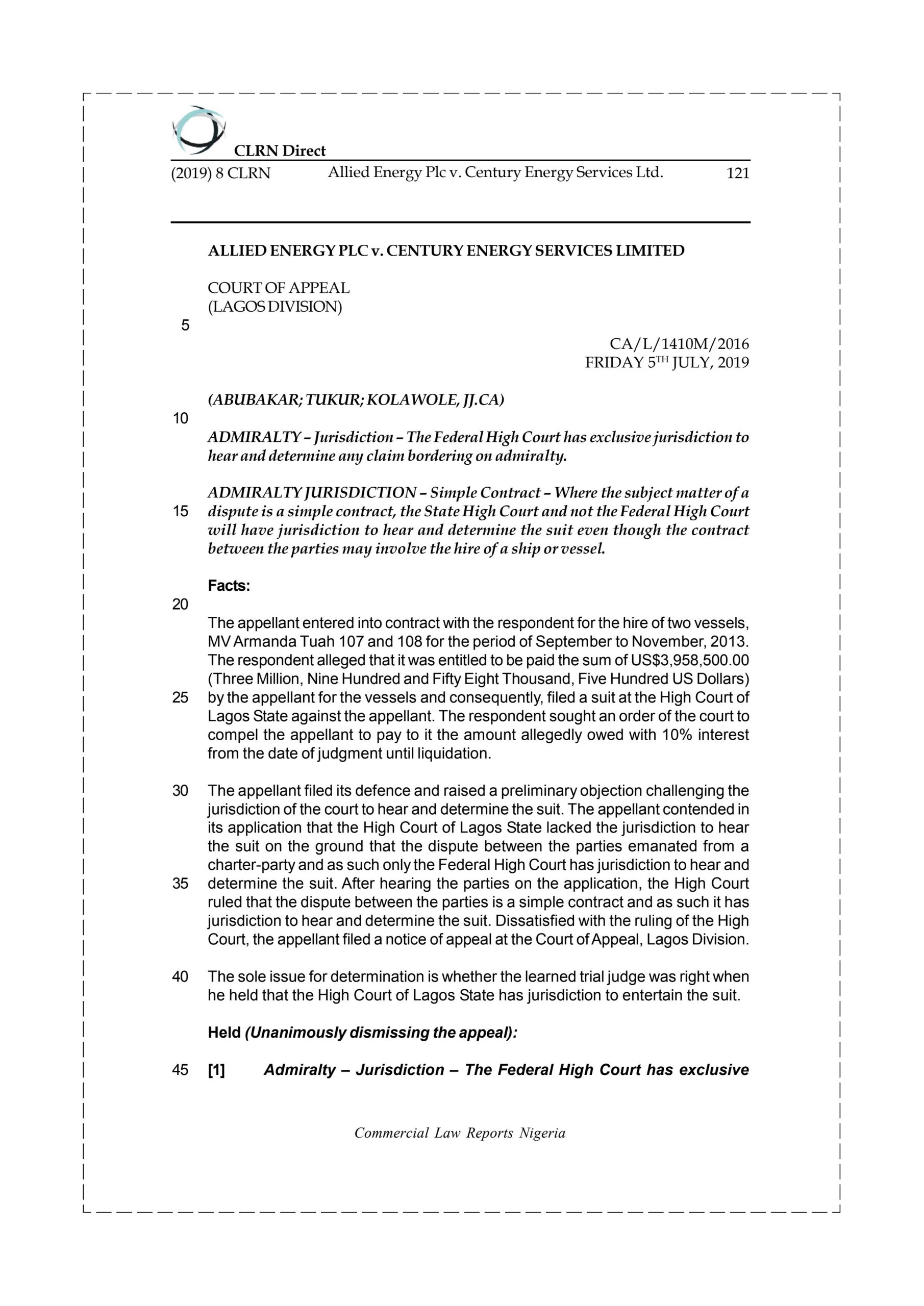 The appellant filed its defence and raised a preliminary objection challenging the jurisdiction of the court to hear and determine the suit. The appellant contended in its application that the High Court of Lagos State lacked the jurisdiction to hear the suit on the ground that the dispute between the parties emanated from a charter-party and as such only the Federal High Court has jurisdiction to hear and determine the suit. After hearing the parties on the application, the High Court ruled that the dispute between the parties is a simple contract and as such it has jurisdiction to hear and determine the suit. Dissatisfied with the ruling of the High Court, the appellant filed a notice of appeal at the Court of Appeal, Lagos Division.