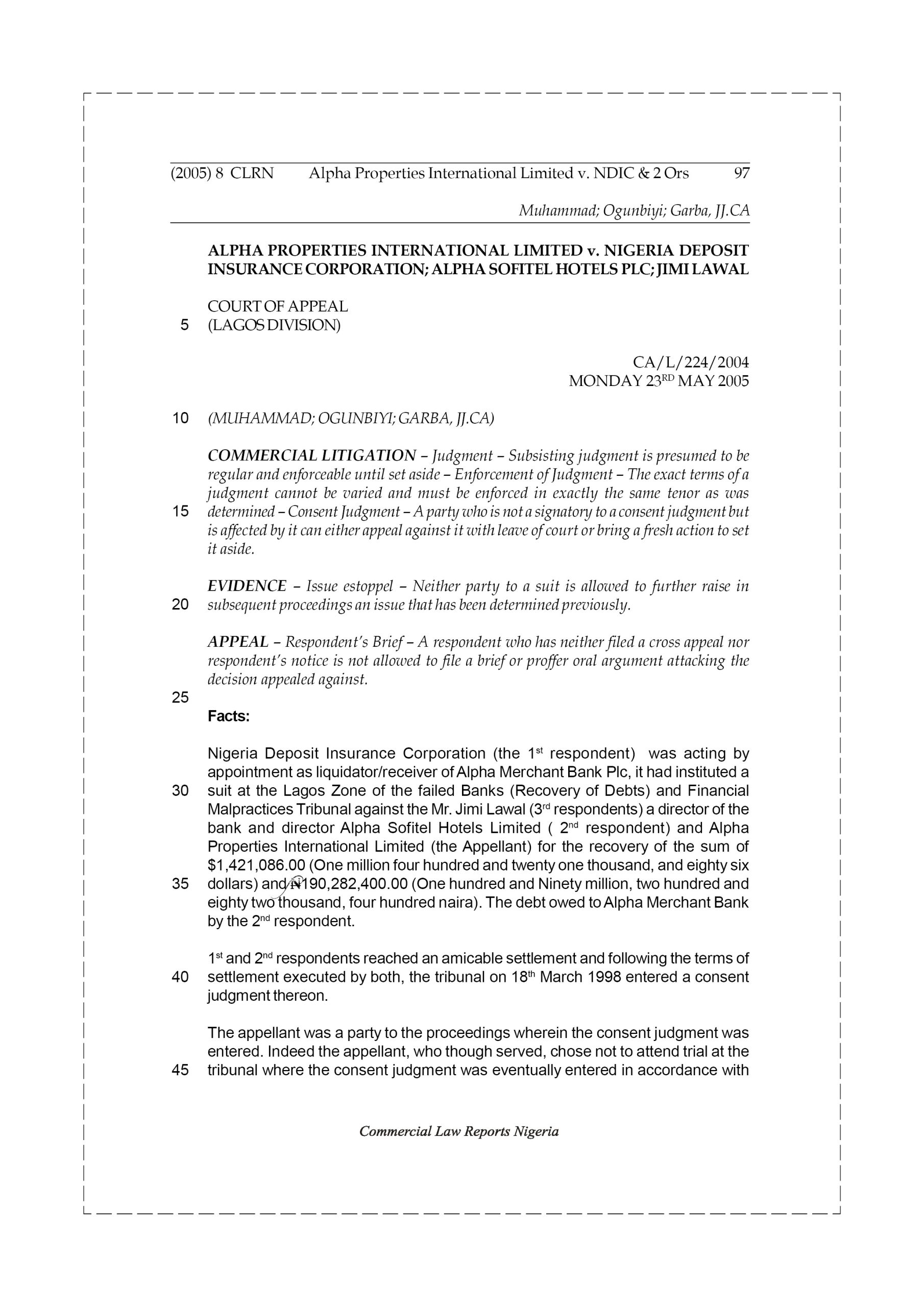 Nigeria Deposit Insurance Corporation (the 1st respondent) was acting by appointment as liquidator/receiver of Alpha Merchant Bank Plc, it had instituted a suit at the Lagos Zone of the failed Banks (Recovery of Debts) and Financial Malpractices Tribunal against the Mr. Jimi Lawal (3rd respondents) a director of the bank and director Alpha Sofitel Hotels Limited ( 2nd respondent) and Alpha Properties International Limited (the Appellant) for the recovery of the sum of $1,421,086.00 (One million four hundred and twenty one thousand, and eighty six dollars) and N190,282,400.00 (One hundred and Ninety million, two hundred and eighty two thousand, four hundred naira). The debt owed to Alpha Merchant Bank by the 2nd respondent.