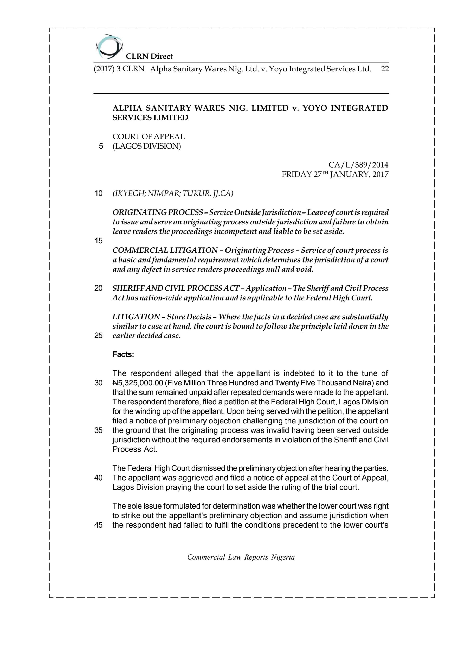 The respondent alleged that the appellant is indebted to it to the tune of N5, 325, 000.00 (Five Million Three Hundred and Twenty Five Thousand Naira) and that the sum remained unpaid after repeated demands were made to the appellant. The respondent therefore, filed a petition at the Federal High Court, Lagos Division for the winding up of the appellant. Upon being served with the petition, the appellant filed a notice of preliminary objection challenging the jurisdiction of the court on the ground that the originating process was invalid having been served outside jurisdiction without the required endorsements in violation of the Sheriff and Civil Process Act.