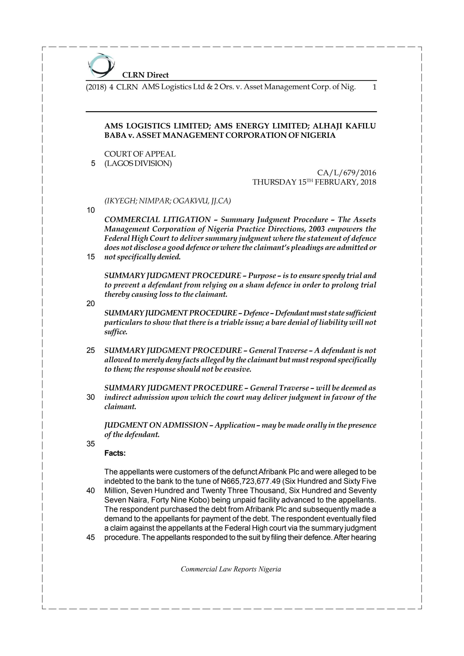 procedure. The appellants responded to the suit by filing their defence. After hearing the parties on the suit, the trial court gave judgment in favour of the respondent on