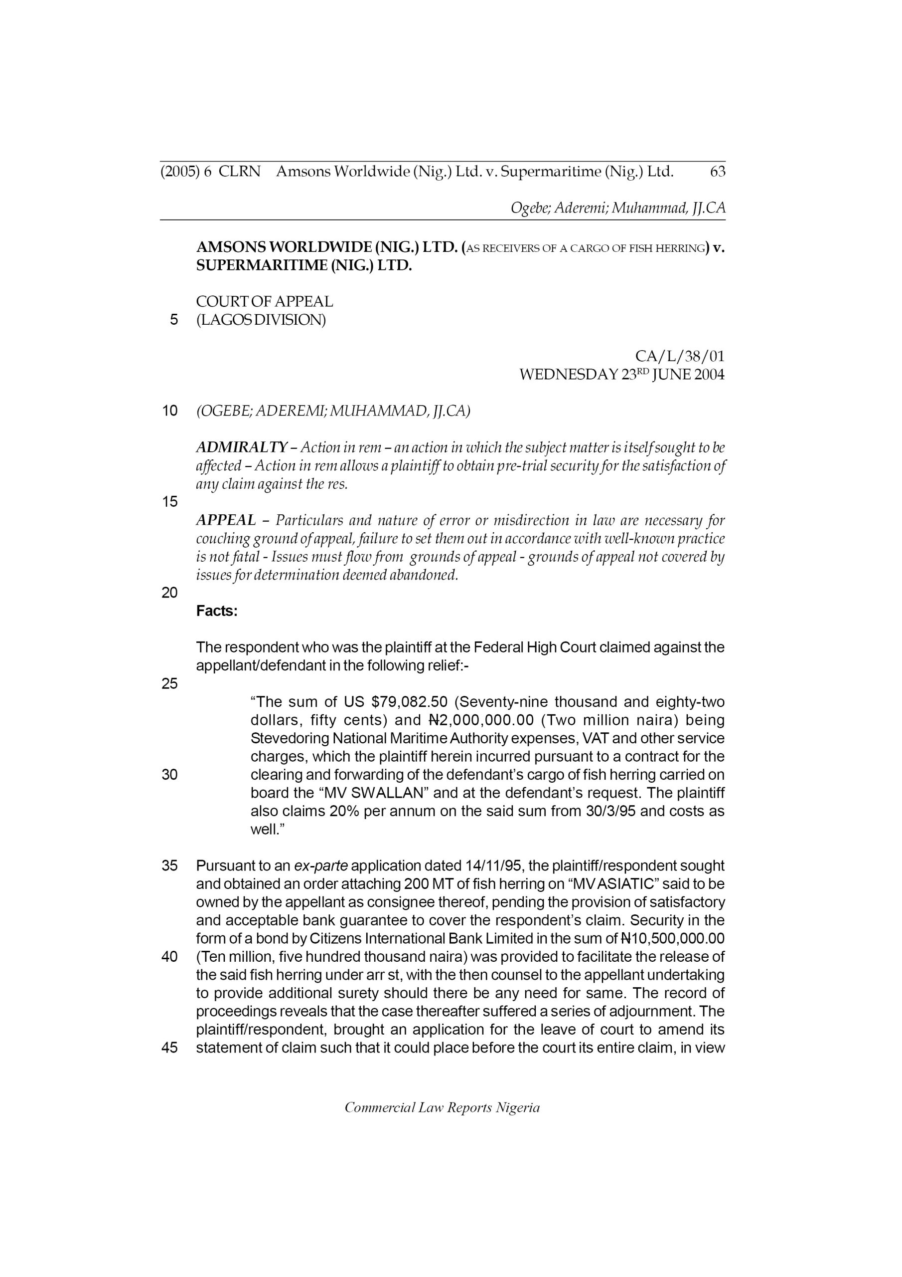 Pursuant to an ex-parte application dated 14/11/95, the plaintiff/respondent sought and obtained an order attaching 200 MT of fish herring on “MV ASIATIC” said to be owned by the appellant as consignee thereof, pending the provision of satisfactory and acceptable bank guarantee to cover the respondent’s claim. Security in the form of a bond by Citizens International Bank Limite