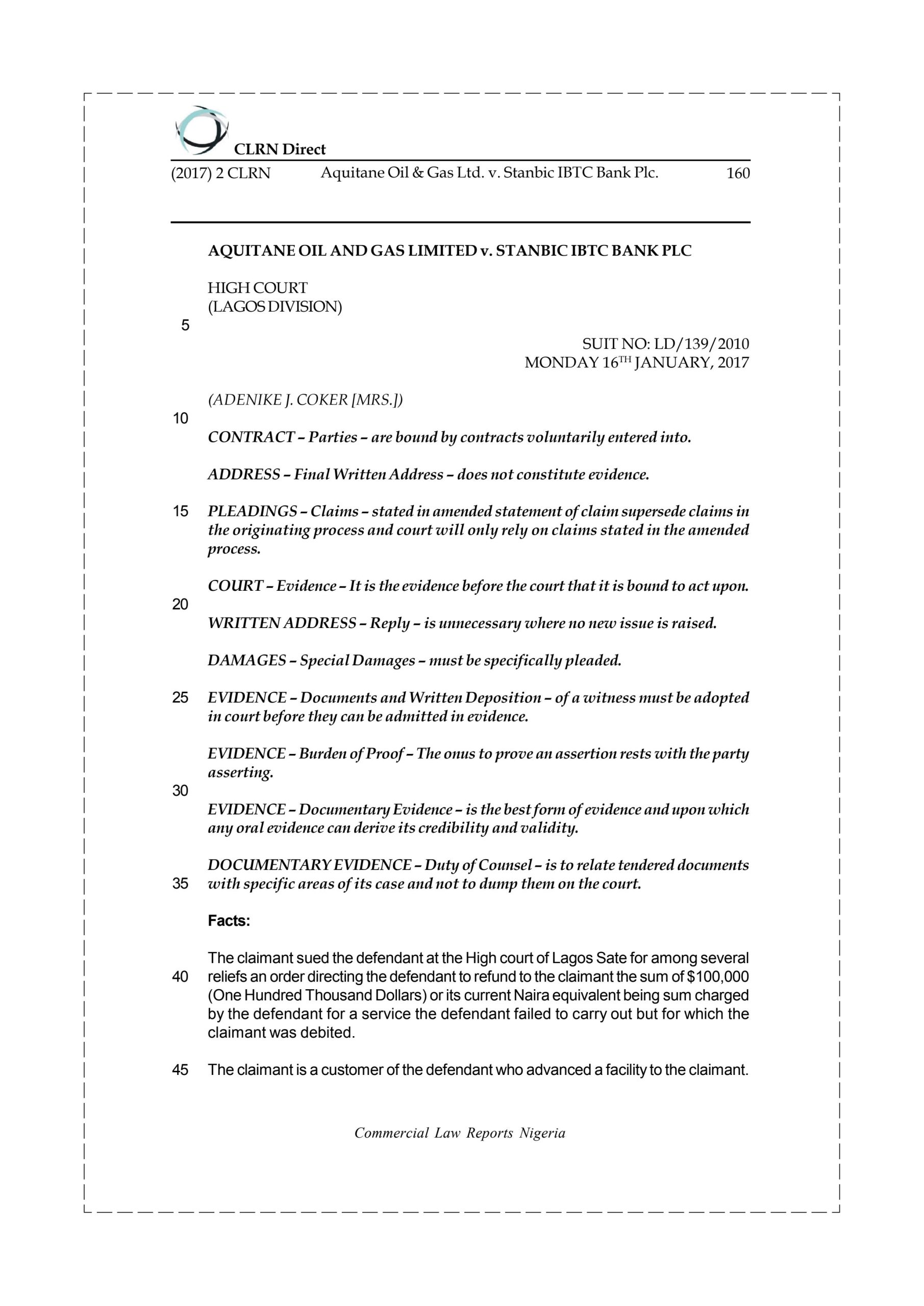 Aquitane Oil & Gas Ltd. v. Stanbic IBTC Bank Plc.