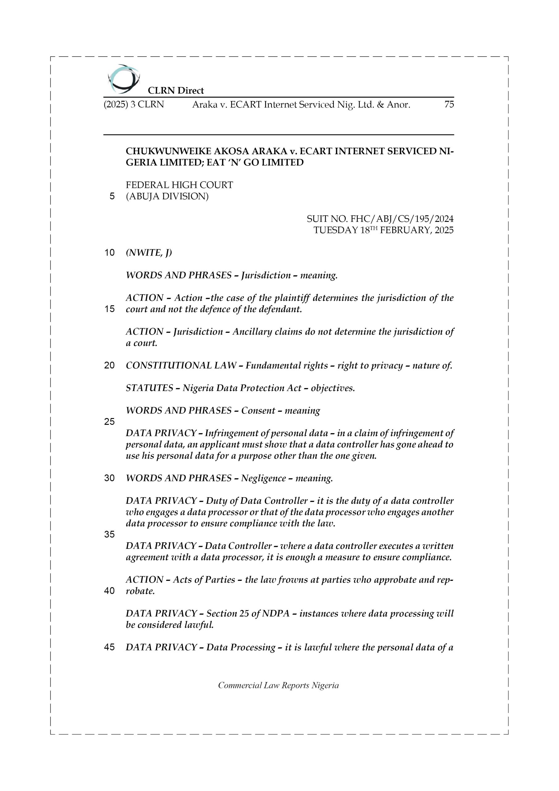 The Applicant in this case, Chukwunweike Akosa Araka, is a registered and frequent user of the now-defunct Jumia Food, a food delivery service offered by Ecart Internet Services (the 1st Respondent), which allows users with smart devices to access local restaurants. The business model of the food delivery platform involved users signing up with their personal details. In turn, Jumia Food, in order to fulfill a food order placed by a customer, would forward the customer’s food order along with the customer’s phone number and address to the restaurant from which the food was ordered. Domino’s Pizza, a restaurant chain owned and operated by Eat ‘N’ Go Limited (the 2nd Respondent), was the Applicant’s favorite vendor on Jumia Food. However, the Applicant has never, at any time, provided Domino’s Pizza with his phone number or house address. In March 2023, the Applicant placed three separate orders from Domino’s Pizza through Jumia Food. Seven months later, the Applicant began receiving direct marketing messages from Domino’s Pizza as a result of his contact details being provided by Jumia Food.