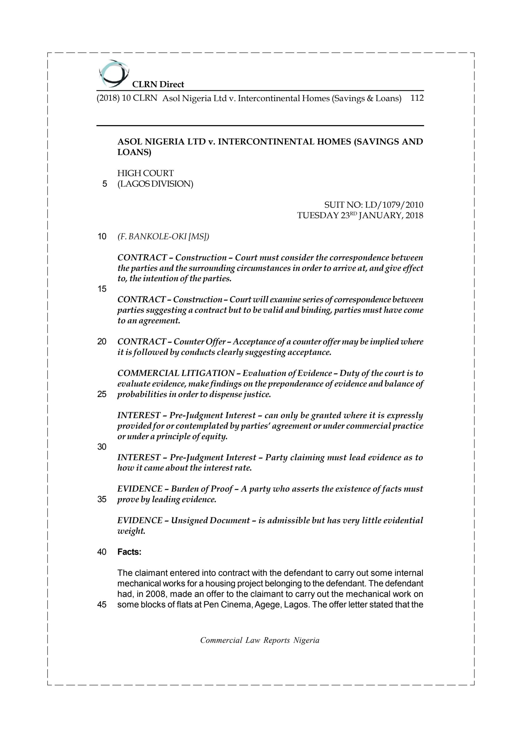 Asol Nigeria Ltd v. Intercontinental Homes (Savings & Loans)