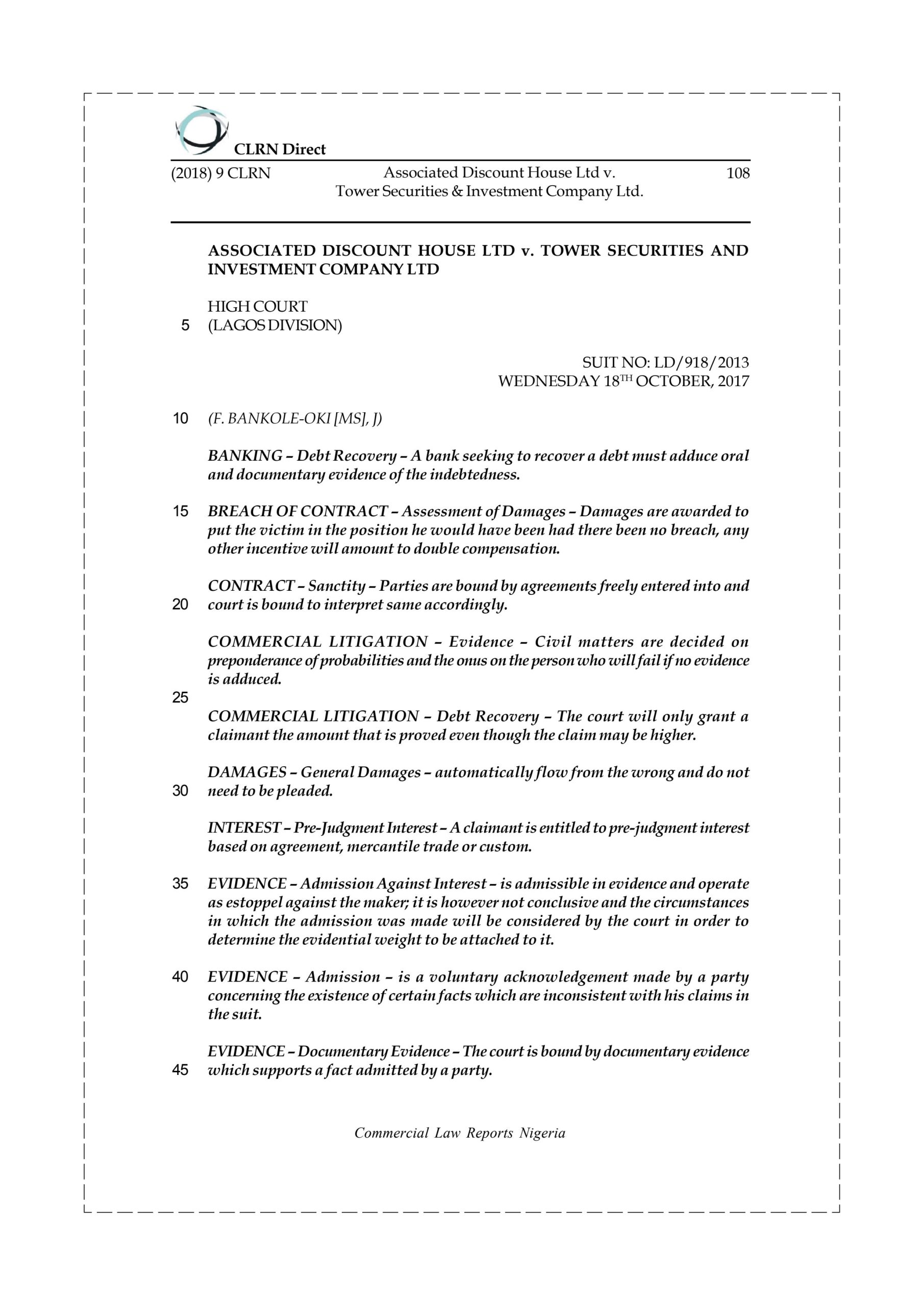 The matter was later referred to the Police. The defendant offered its properties, thirty plots of land and also made a payment of N500,000.00 (Five Hundred Thousand Naira) to the claimant in order to liquidate the debt. After reconciling accounts, the balance came to a total sum of N115.200,000.00 (One Hundred and Fifteen Million Two Hundred Thousand Naira). The defendant failed to pay the balance after repeated demands and the claimant filed a suit against the defendant at the High Court of Lagos State claiming sum of N218,033,479.26 (Two Hundred and Eighteen Million, Thirty Three Thousand, Four Hundred and Seventy Nine Naira, Twenty Six Kobo) being the outstanding balance on the debt as at 1st October, 2013, interest of 16% on the accrued amount, damages and costs.