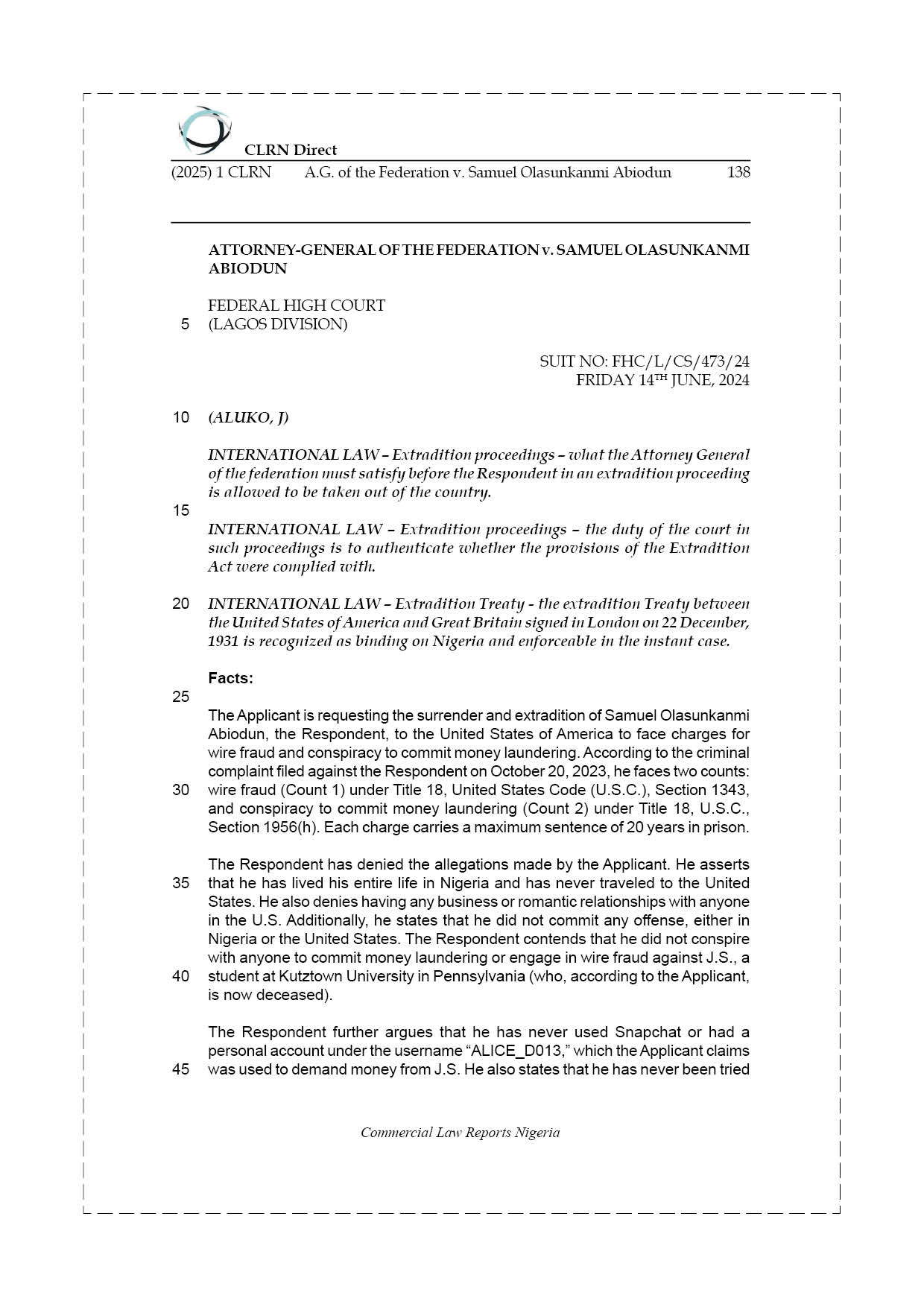 The Applicant is requesting the surrender and extradition of Samuel Olasunkanmi Abiodun, the Respondent, to the United States of America to face charges for wire fraud and conspiracy to commit money laundering. According to the criminal complaint filed against the Respondent on October 20, 2023, he faces two counts: wire fraud (Count 1) under Title 18, United States Code (U.S.C.), Section 1343, and conspiracy to commit money laundering (Count 2) under Title 18, U.S.C., Section 1956(h). Each charge carries a maximum sentence of 20 years in prison.