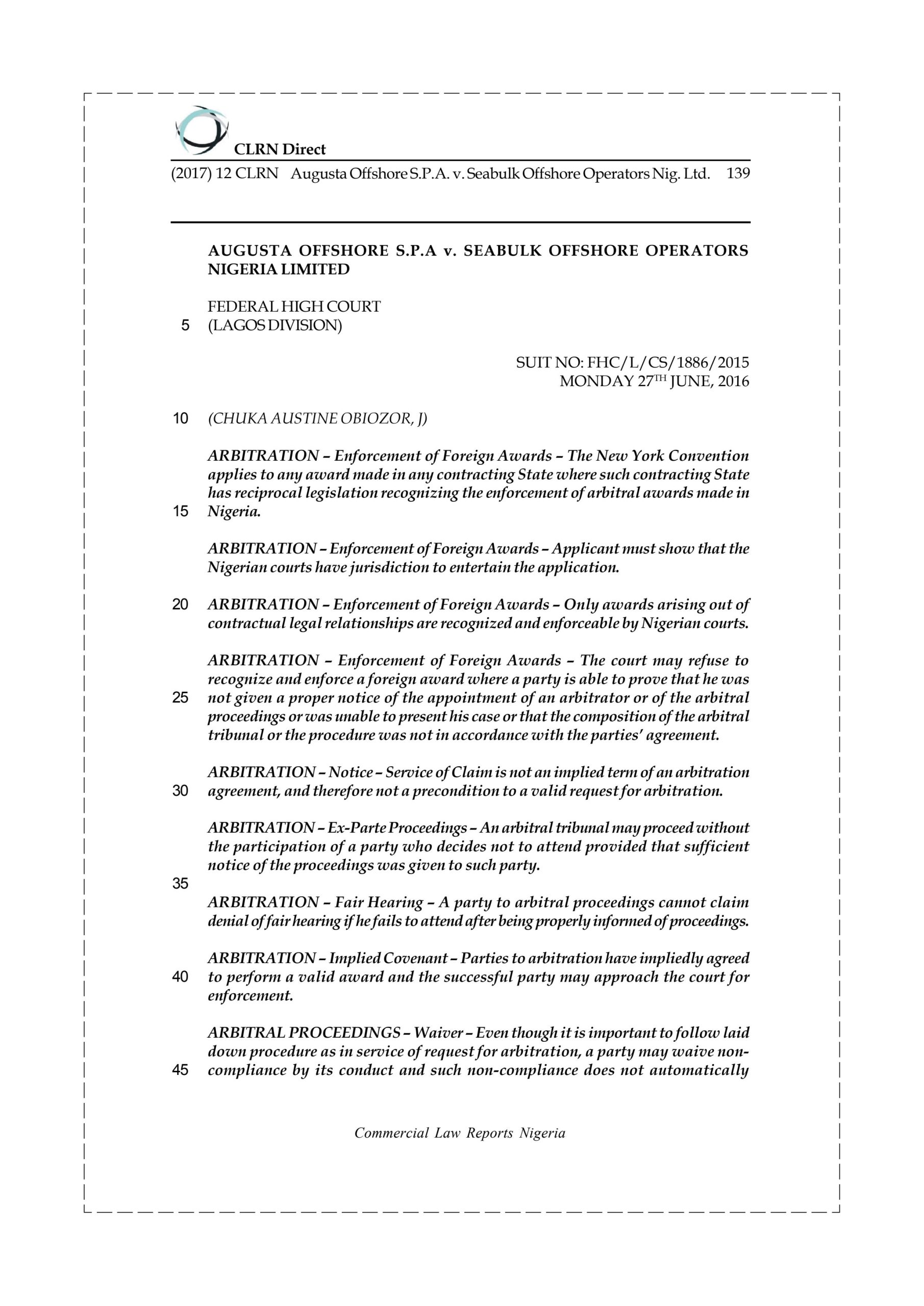 In December, 2015 the applicant filed a motion at the Federal High Court, Lagos Division seeking to enforce the arbitral award delivered in London, England. The respondent opposed the application on the grounds that: it was not given proper notice of the appointment of the arbitrator and the arbitral proceedings; it was unable to present its case; and that the composition of the arbitral tribunal was not in accordance with the parties’ agreement. The issues raised in the application border on whether the court in Nigeria can recognize and enforce an award made in England, United Kingdom and whether the defences of improper notice of the appointment of arbitrator and the arbitral proceedings can avail the respondent.