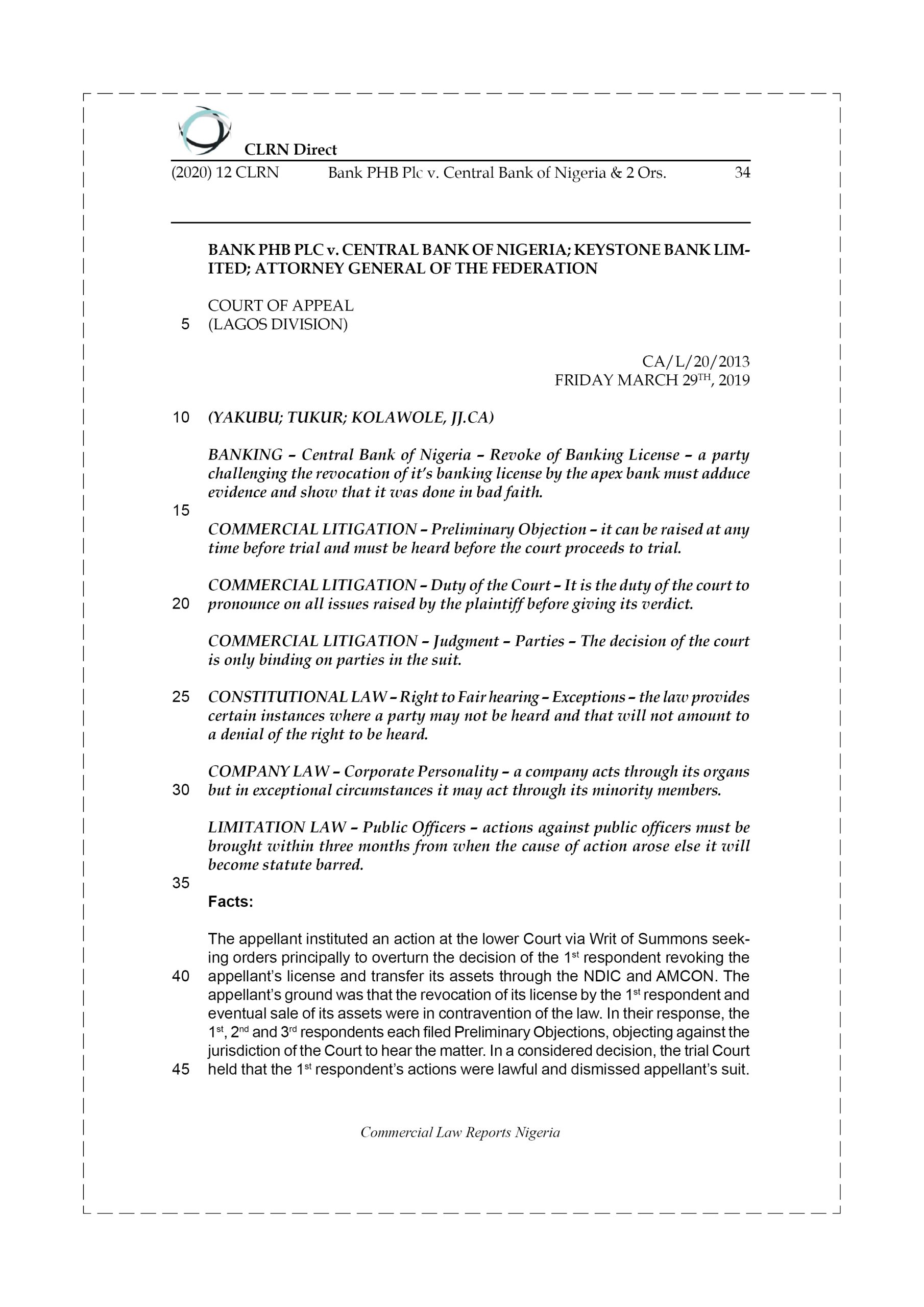 The appellant instituted an action at the lower Court via Writ of Summons seeking orders principally to overturn the decision of the 1st respondent revoking the appellant’s license and transfer its assets through the NDIC and AMCON. The appellant’s ground was that the revocation of its license by the 1st respondent and eventual sale of its assets were in contravention of the law. In their response, the 1st, 2nd and 3rd respondents each filed Preliminary Objections, objecting against the jurisdiction of the Court to hear the matter. In a considered decision, the trial Court held that the 1st respondent’s actions were lawful and dismissed appellant’s suit.