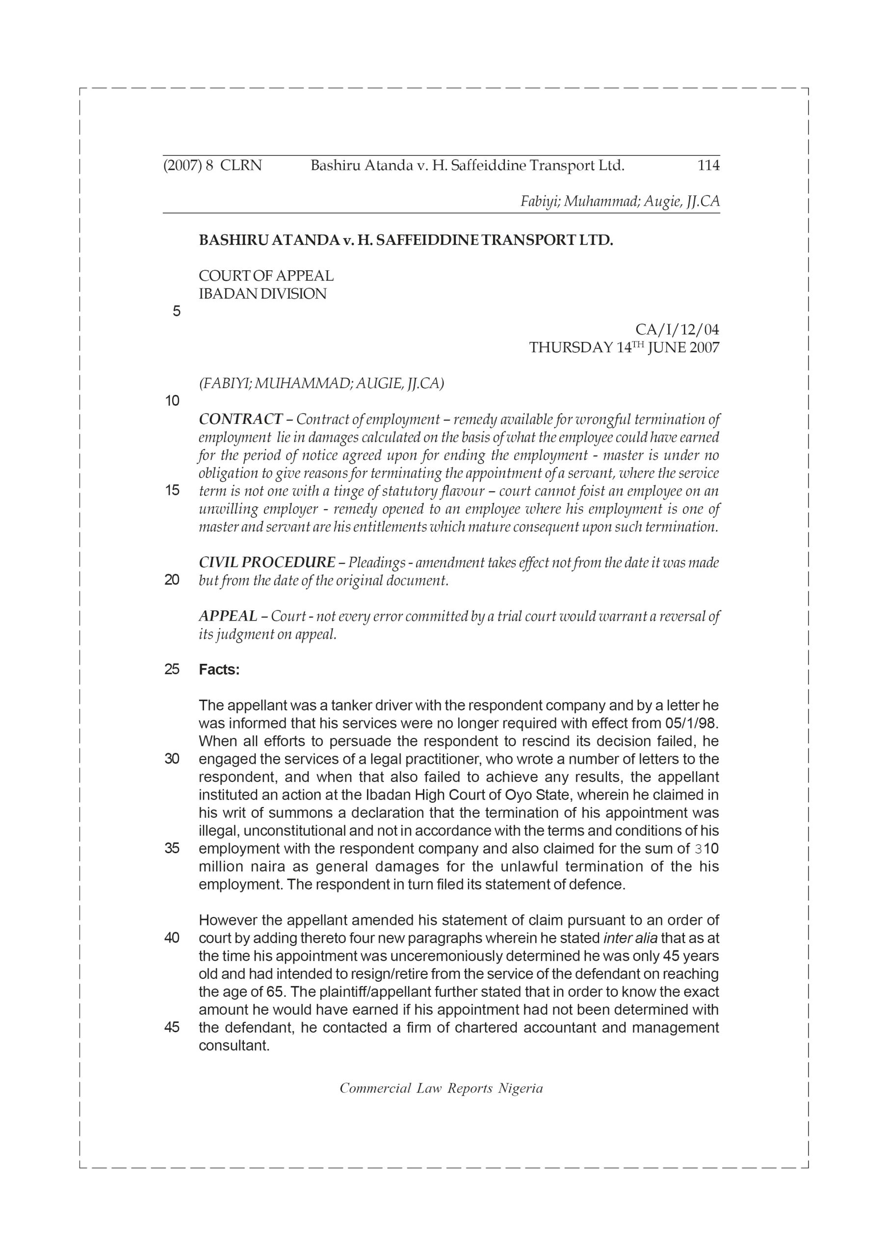 The appellant was a tanker driver with the respondent company and by a letter he was informed that his services were no longer required with effect from 05/1/98. When all efforts to persuade the respondent to rescind its decision failed, he engaged the services of a legal practitioner, who wrote a number of letters to the respondent, and when that also failed to achieve any results, the appellant instituted an action at the Ibadan High Court of Oyo State, wherein he claimed in his writ of summons a declaration that the termination of his appointment was illegal, unconstitutional and not in accordance with the terms and conditions of his employment with the respondent company and also claimed for the sum of N10 million naira as general damages for the unlawful termination of the his employment. The respondent in turn filed its statement of defence.