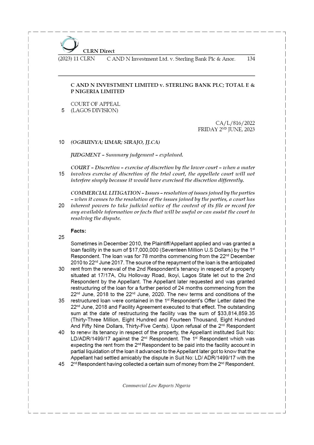 C AND N INVESTMENT LTD. v. STERLING BANK PLC & ANOR.