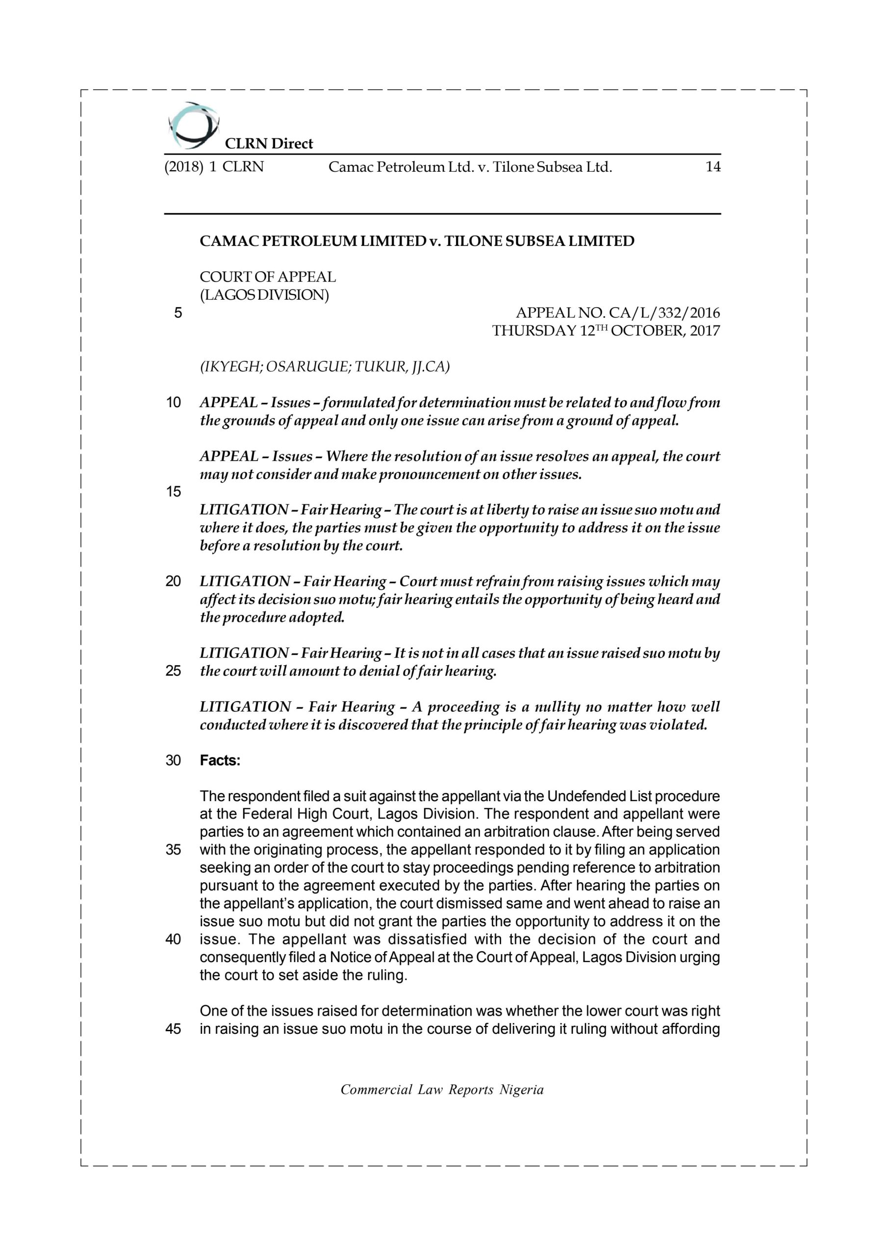 The respondent filed a suit against the appellant via the Undefended List procedure at the Federal High Court, Lagos Division. The respondent and appellant were parties to an agreement which contained an arbitration clause. After being served with the originating process, the appellant responded to it by filing an application seeking an order of the court to stay proceedings pending reference to arbitration pursuant to the agreement executed by the parties. After hearing the parties on the appellant’s application, the court dismissed same and went ahead to raise an issue suo motu but did not grant the parties the opportunity to address it on the issue. The appellant was dissatisfied with the decision of the court and
