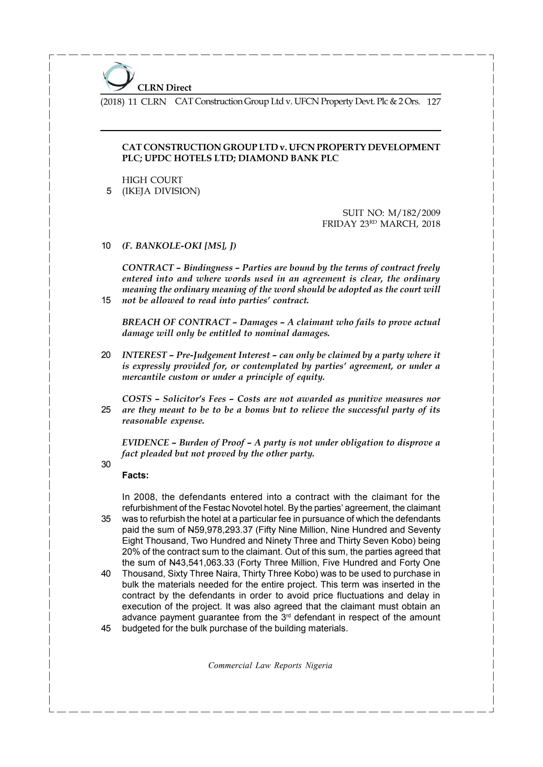 In 2008, the defendants entered into a contract with the claimant for the refurbishment of the Festac Novotel hotel. By the parties’ agreement, the claimant was to refurbish the hotel at a particular fee in pursuance of which the defendants paid the sum of N59,978,293.37 (Fifty Nine Million, Nine Hundred and Seventy Eight Thousand, Two Hundred and Ninety Three and Thirty Seven Kobo) being 20% of the contract sum to the claimant. Out of this sum, the parties agreed that the sum of N43,541,063.33 (Forty Three Million, Five Hundred and Forty One Thousand, Sixty Three Naira, Thirty Three Kobo) was to be used to purchase in bulk the materials needed for the entire project. This term was inserted in the contract by the defendants in order to avoid price fluctuations and delay in execution of the project. It was also agreed that the claimant must obtain an advance payment guarantee from the 3rd defendant in respect of the amount budgeted for the bulk purchase of the building materials.