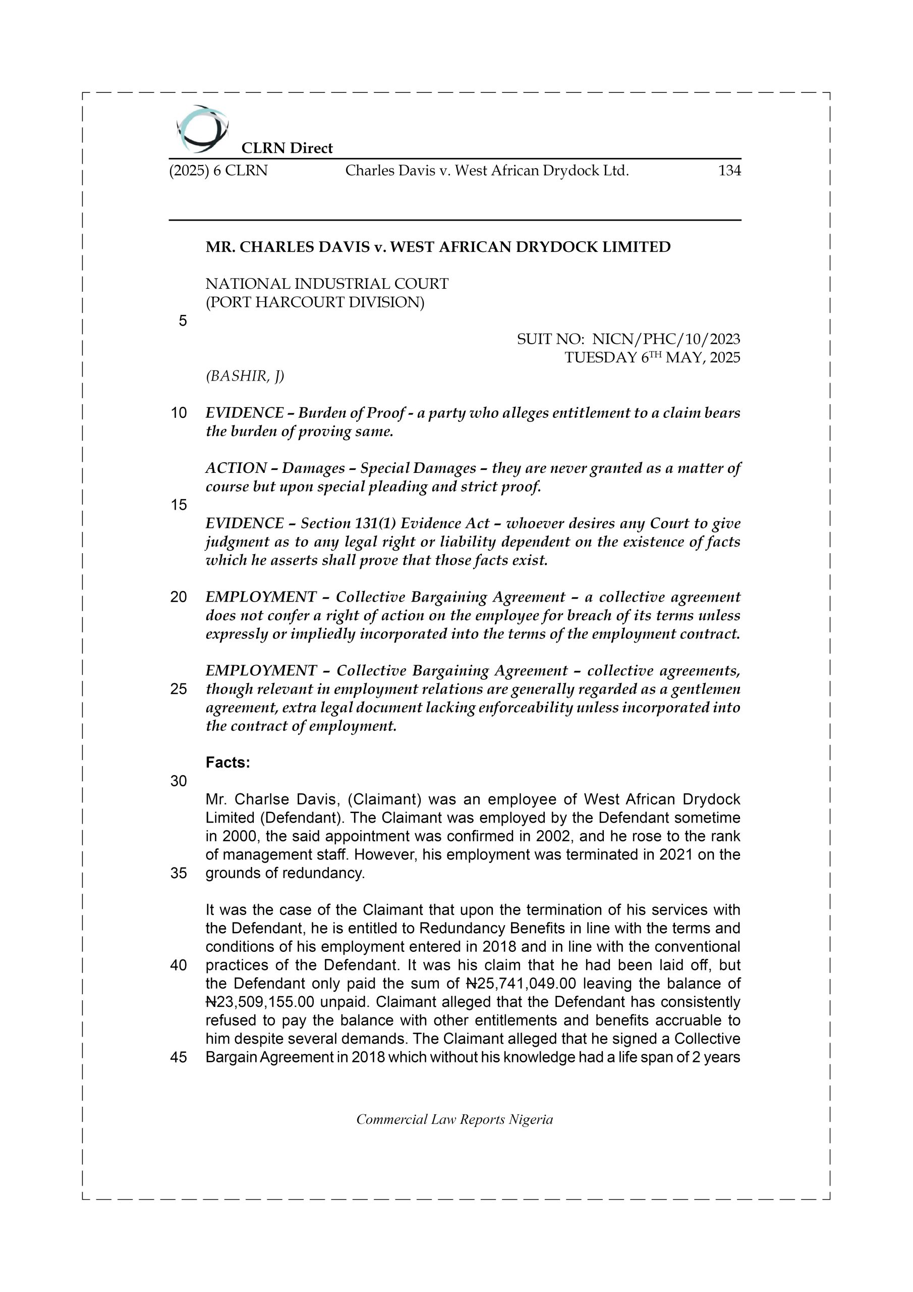 Mr. Charlse Davis, (Claimant) was an employee of West African Drydock Limited (Defendant). The Claimant was employed by the Defendant sometime in 2000, the said appointment was confirmed in 2002, and he rose to the rank of management staff. However, his employment was terminated in 2021 on the grounds of redundancy.