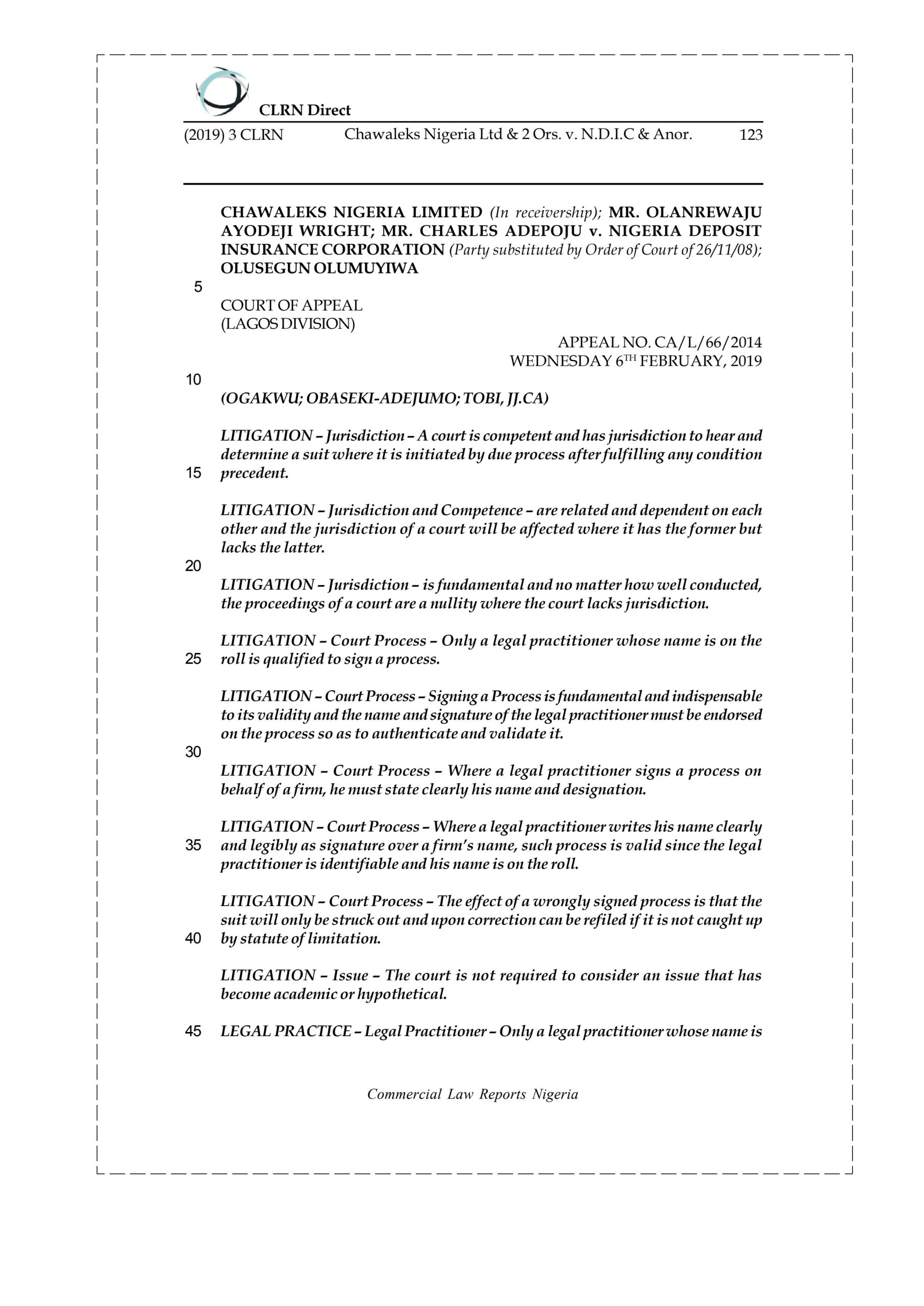 The appellants were customers of the defunct City Express Bank Limited. The bank had extended a facility to the appellants and when it appeared to it that the appellants were unable or unwilling to repay the facility, the bank filed a suit at the Federal High Court against the appellants for the recovery of the debt. In the course of proceedings, the bank was substituted for the 1st respondent following the former’s liquidation and take-over by the latter. The suit was commenced via originating summons but the process was not properly signed in accordance with the Legal Practitioner’s Act. The appellants filed a counterclaim and after hearing the parties, the counterclaim was dismissed and the court held that the appellants were indebted to the 1st respondent to the tune of N47,135,498.15 (Forty Seven Million, One Hundred and Thirty Five Thousand, Four Hundred and Ninety Eight Naira, Fifteen Kobo) including other reliefs.