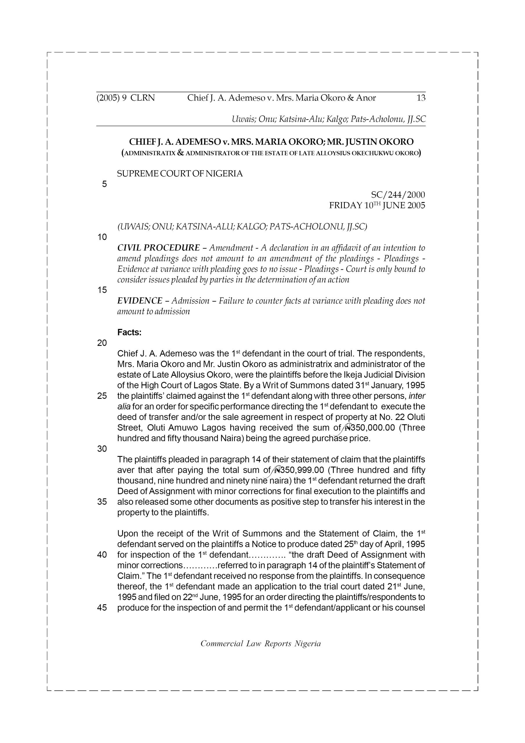 Chief J. A. Ademeso was the 1st defendant in the court of trial. The respondents, Mrs. Maria Okoro and Mr. Justin Okoro as administratrix and administrator of the estate of Late Alloysius Okoro, were the plaintiffs before the Ikeja Judicial Division of the High Court of Lagos State. By a Writ of Summons dated 31st January, 1995 the plaintiffs’ claimed against the 1st defendant along with three other persons, inter alia for an order for specific performance directing the 1st defendant to execute the deed of transfer and/or the sale agreement in respect of property at No. 22 Oluti Street, Oluti Amuwo Lagos having received the sum of N350,000.00 (Three hundred and fifty thousand Naira) being the agreed purchase price.