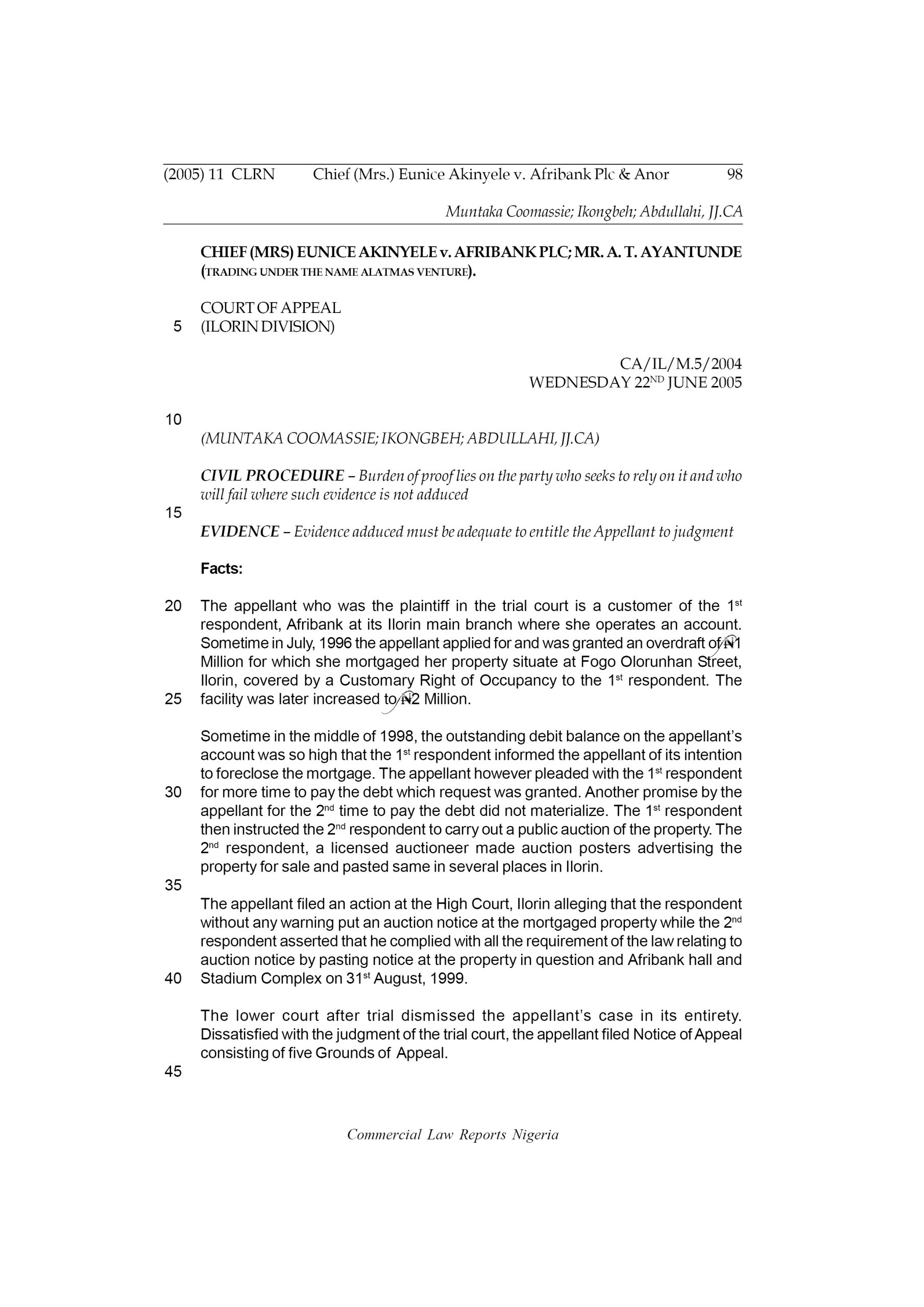 The appellant who was the plaintiff in the trial court is a customer of the 1st respondent, Afribank at its Ilorin main branch where she operates an account. Sometime in July, 1996 the appellant applied for and was granted an overdraft of N1 Million for which she mortgaged her property situate at Fogo Olorunhan Street, Ilorin, covered by a Customary Right of Occupancy to the 1st respondent. The facility was later increased to N2 Million.