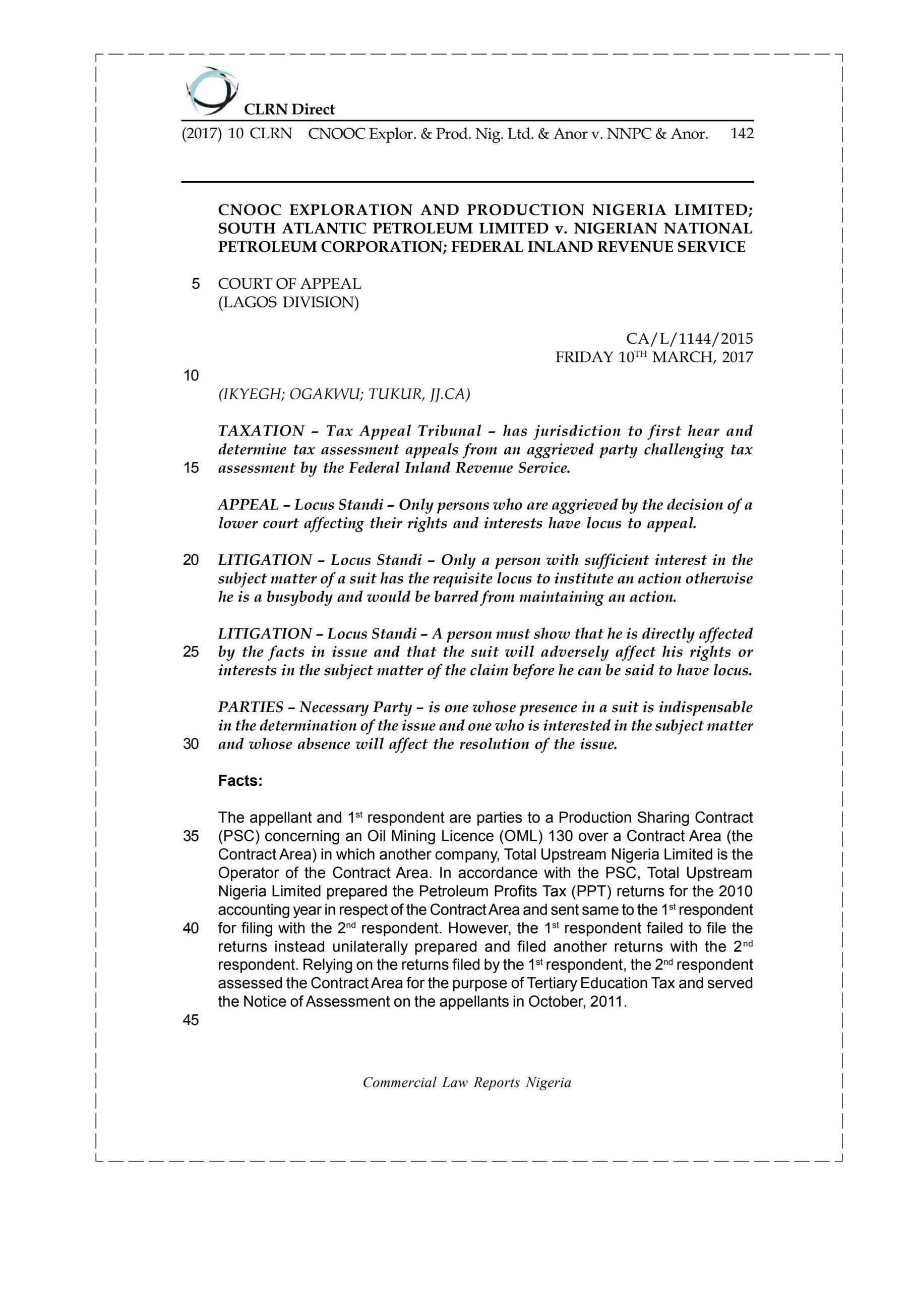 The appellant and 1st respondent are parties to a Production Sharing Contract (PSC) concerning an Oil Mining Licence (OML) 130 over a Contract Area (the Contract Area) in which another company, Total Upstream Nigeria Limited is the Operator of the Contract Area. In accordance with the PSC, Total Upstream Nigeria Limited prepared the Petroleum Profits Tax (PPT) returns for the 2010 accounting year in respect of the Contract Area and sent same to the 1st respondent for filing with the 2nd respondent. However, the 1st respondent failed to file the returns instead unilaterally prepared and filed another returns with the 2nd respondent. Relying on the returns filed by the 1st respondent, the 2nd respondent assessed the Contract Area for the purpose of Tertiary Education Tax and served the Notice of Assessment on the appellants in October, 2011.