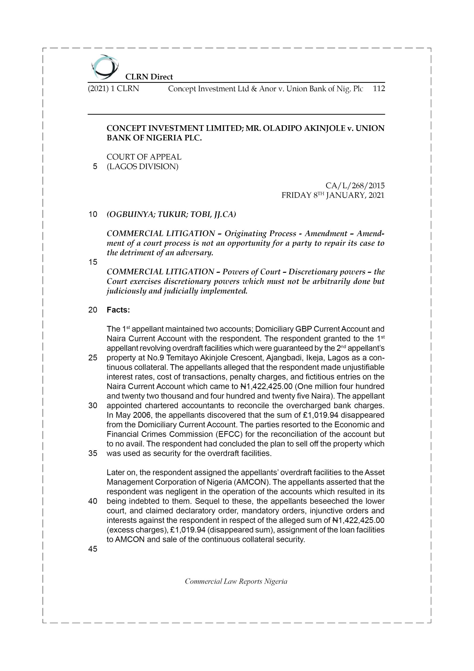 The 1st appellant maintained two accounts; Domiciliary GBP Current Account and Naira Current Account with the respondent. The respondent granted to the 1st appellant revolving overdraft facilities which were guaranteed by the 2nd appellant’s property at No.9 Temitayo Akinjole Crescent, Ajangbadi, Ikeja, Lagos as a continuous collateral. The appellants alleged that the respondent made unjustifiable interest rates, cost of transactions, penalty charges, and fictitious entries on the Naira Current Account which came to N1,422,425.00 (One million four hundred and twenty two thousand and four hundred and twenty five Naira). The appellant appointed chartered accountants to reconcile the overcharged bank charges. In May 2006, the appellants discovered that the sum of £1,019.94 disappeared from the Domiciliary Current Account. The parties resorted to the Economic and Financial Crimes Commission (EFCC) for the reconciliation of the account but to no avail. The respondent had concluded the plan to sell off the property which was used as security for the overdraft facilities.