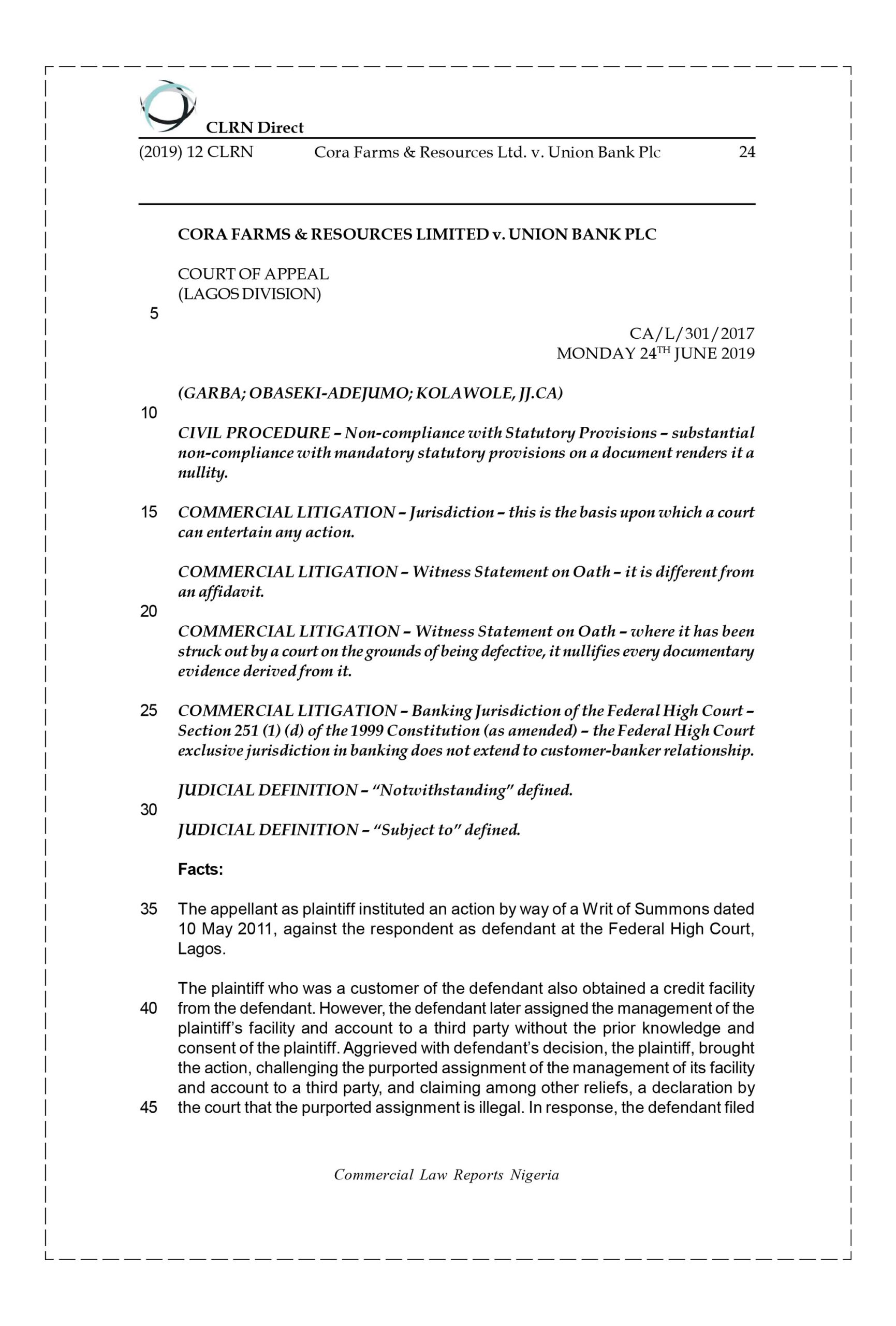 CORA FARMS & RESOURCES LTD. v. UNION BANK PLC