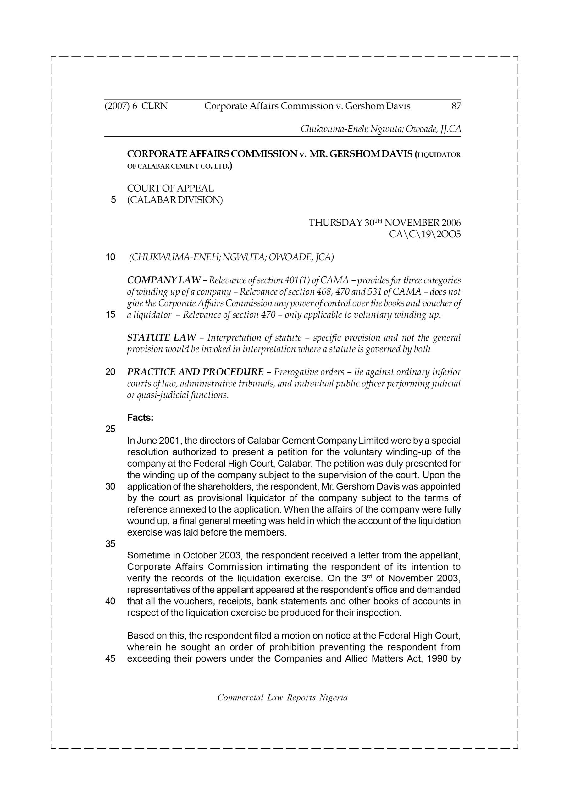 In June 2001, the directors of Calabar Cement Company Limited were by a special resolution authorized to present a petition for the voluntary winding-up of the company at the Federal High Court, Calabar. The petition was duly presented for the winding up of the company subject to the supervision of the court. Upon the application of the shareholders, the respondent, Mr. Gershom Davis was appointed by the court as provisional liquidator of the company subject to the terms of reference annexed to the application. When the affairs of the company were fully wound up, a final general meeting was held in which the account of the liquidation exercise was laid before the members.