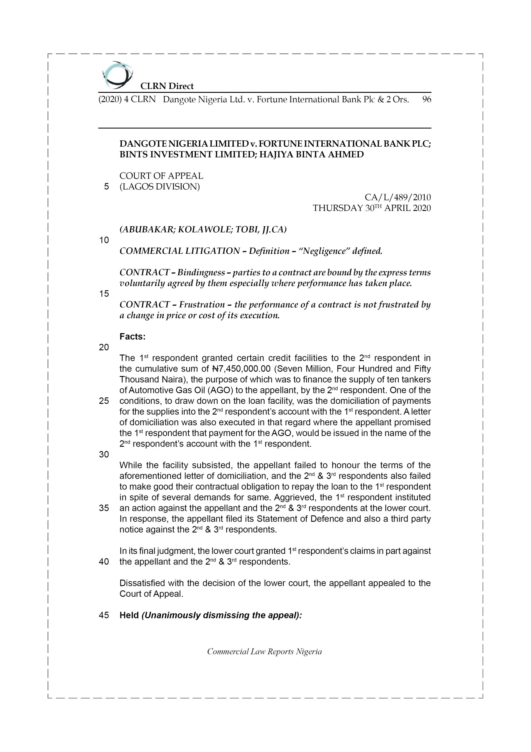 A letter of domiciliation was also executed in that regard where the appellant promised the 1st respondent that payment for the AGO, would be issued in the name of the 2nd respondent’s account with the 1st respondent. While the facility subsisted, the appellant failed to honour the terms of the aforementioned letter of domiciliation, and the 2nd & 3rd respondents also failed to make good their contractual obligation to repay the loan to the 1st respondent in spite of several demands for same. Aggrieved, the 1st respondent instituted an action against the appellant and the 2nd & 3rd respondents at the lower court. In response, the appellant filed its Statement of Defence and also a third party notice against the 2nd & 3rd respondents.