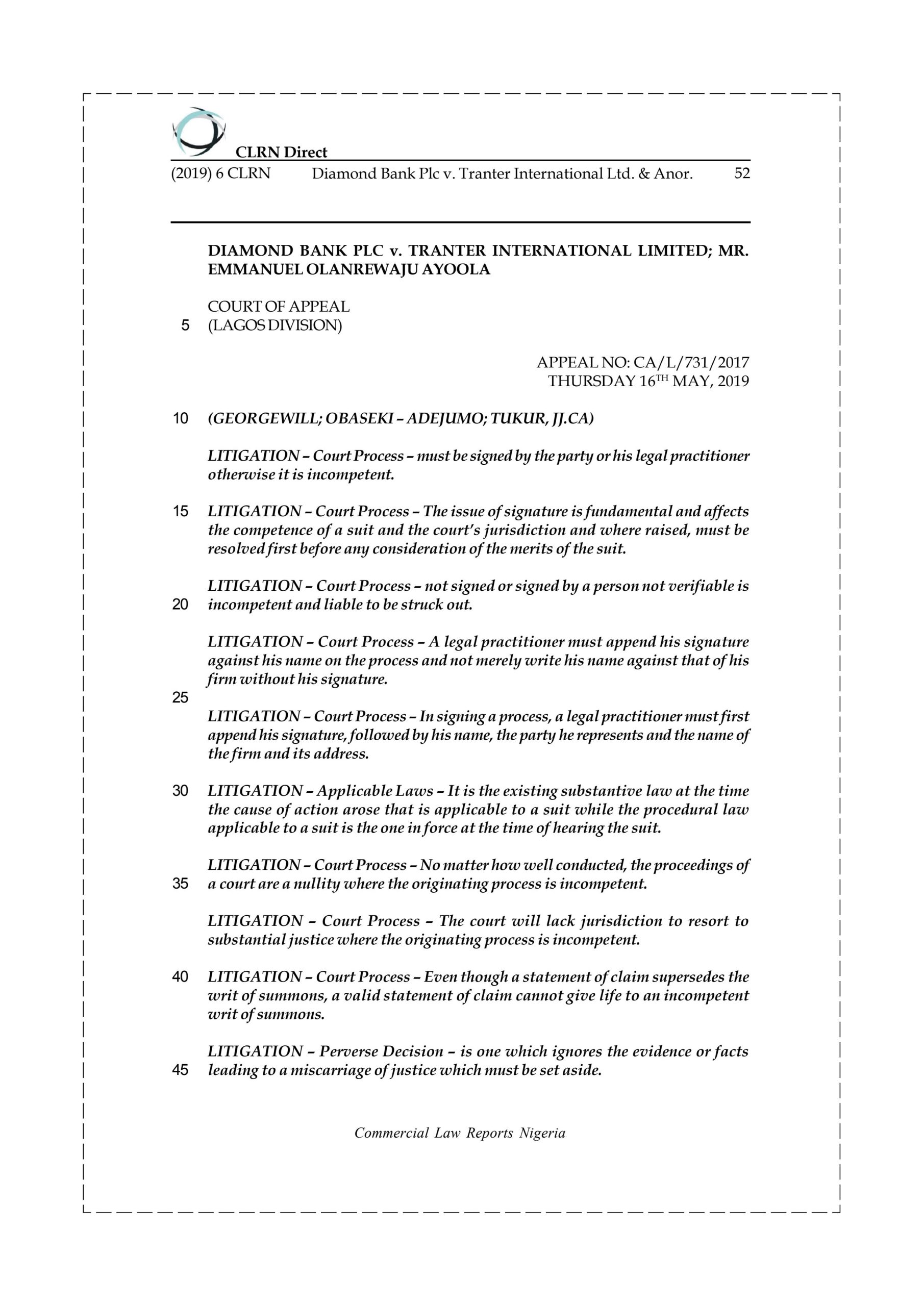 The respondents are customers of the appellant. They sued the appellant for conversion, fraud, and breach of trust and fiduciary duties at the Federal High Court, Lagos Division. The suit was filed in 2006 to recover an alleged debt in local and foreign currencies. The respondents alleged that the appellant was indebted to them to the tune of N176,406,301.73 (One Hundred and Seventy Six Million, Four Hundred and Six Thousand, Three Hundred and One Naira, Seventy Three Kobo). They requested interest of 21% on the sum from August 2005 and also sought the order of the court to compel the appellant to immediately release to the 1st respondent, the sum of N15,000,000.00 (Fifteen Million Naira) for onward remittance to the Federal Inland Revenue Service, FIRS which they alleged was the Value Added Tax withheld by the appellant. Furthermore, they also claimed the sums of $5,737.55 (Five Thousand Seven Hundred and Thirty Seven United States Dollars, Fifty Five Cents) and $88,000.00 (Eighty Eight Thousand United States Dollars, respectively). They alleged that these sums were monies paid by Shell Petroleum Development Company Nigeria Limited to the 1st respondent through the appellant which were unlawfully withheld. Meanwhile, the writ of summons was signed in the name of a firm and not in the name of a legal practitioner. The appellant filed an application challenging the competence of the suit on the ground that the process was not signed by a legal practitioner making it incompetent and asking the court to strike it out. The respondents challenged the application and filed a counter affidavit. They argued that the writ of summons was competent because it was filed pursuant to the Federal High Court (Civil Procedure) Rules, 2000 which were the extant Rules of Court at the time and that the writ of summons conforms to the said Rules. After hearing the parties on the application, the trial court ruled in favour of the respondents and held that the writ of summons was in compliance with the rules. The appellant was dissatisfied with the ruling of the trial court and filed a notice of appeal at the Court of Appeal, Lagos Division. The sole issue for determination is whether the writ of summons was capable of vesting jurisdiction in the trial court and whether the court was not wrong when it held that the originating process was competent and not invalidated by the signature in the firm’s name.