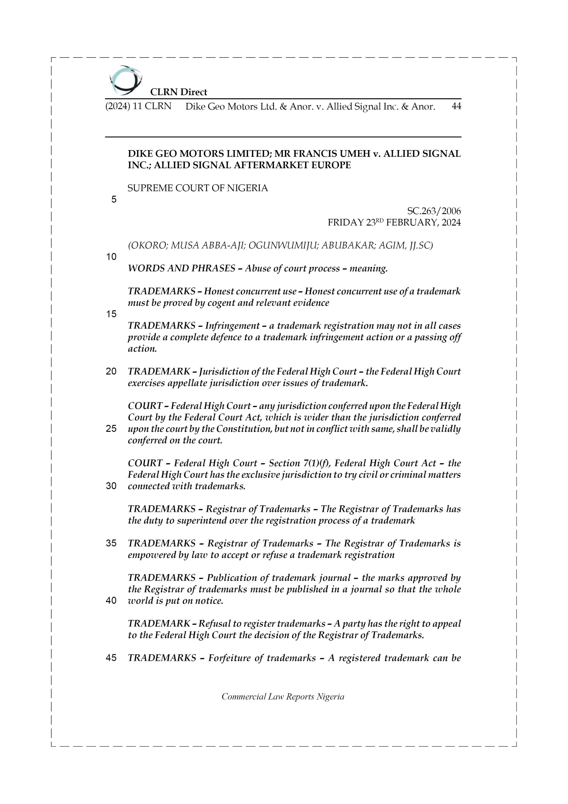 The Plaintiff is an American company formally name “allied Corporation” and it owns various trademarks under which it manufactures and sells brake and clutch fluids for motor vehicles. The 2nd Plaintiff is a French company and a subsidiary of the 1st Plaintiff. It manufactures brakes and fluids under the trademark owned by the 1st Plaintiff and have been marketing their products here in Nigeria for several years in distinctively black and white cans. The 1st Defendant is a Nigerian company engaged in the manufacture of, importation and sale of brake and clutch fluid. The 2nd Defendant is its chief executive officer.