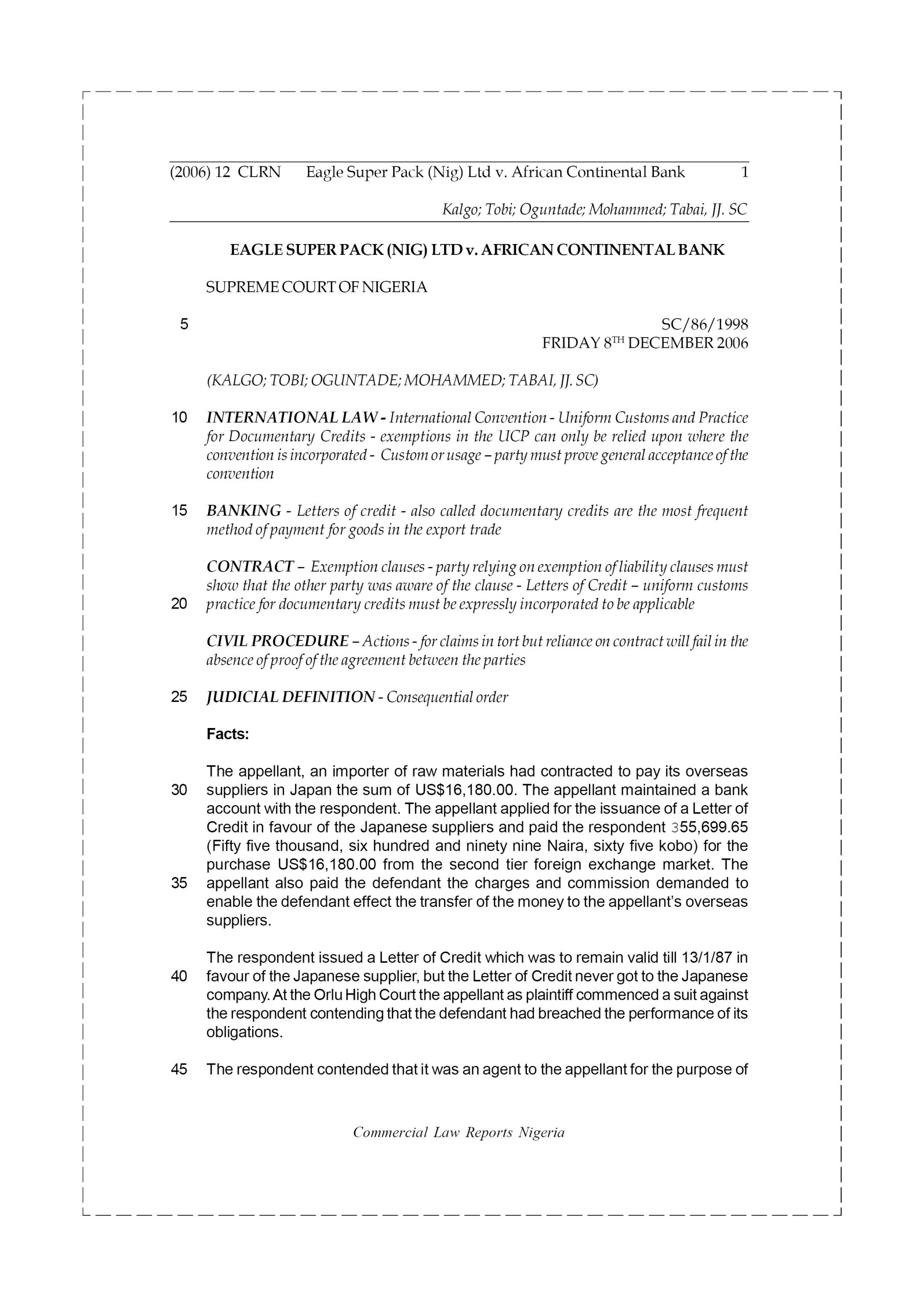 The appellant, an importer of raw materials had contracted to pay its overseas suppliers in Japan the sum of US$16,180.00. The appellant maintained a bank account with the respondent. The appellant applied for the issuance of a Letter of Credit in favour of the Japanese suppliers and paid the respondent 355,699.65 (Fifty five thousand, six hundred and ninety nine Naira, sixty five kobo) for the purchase US$16,180.00 from the second tier foreign exchange market. The appellant also paid the defendant the charges and commission demanded to enable the defendant effect the transfer of the money to the appellant’s overseas suppliers.