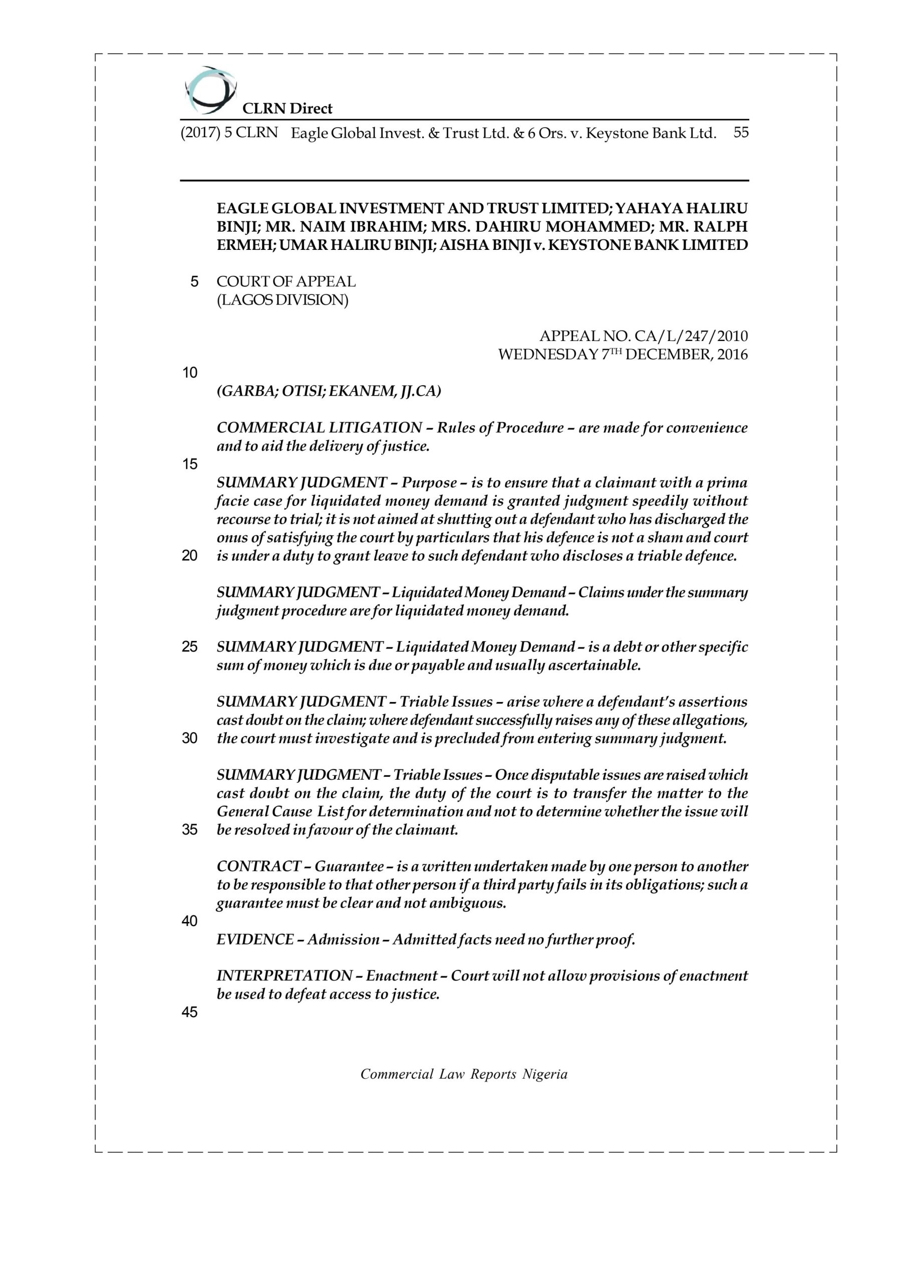 The respondent, in September 2001, sued the appellants at the Lagos State High Court to recover a facility of N100,000,000.00 (One Hundred Million Naira) including accrued interests, allegedly granted to the 1st appellant and guaranteed by the 2nd to 6th appellants. The respondent filed the action under the summary judgment procedure alleging that certain agreements were entered into between the respondent and the 2nd to 6th appellants in which the later agreed to guarantee the loan. It was further alleged that pursuant to the loan agreement, certain properties were used as security for the loan. The respondent contended that the 4th appellant agreed and deposited title documents to her properties at Plot 485, Cadastral Zone AQ, Abuja and Plot 154, Cadastral Zone A2, Zone 6, Wuse District, Abuja to be used as security for the loan. The 2nd appellant was also alleged to have deposited with the respondent title documents to his properties situate at No 8 Maiduguri Road, Sokoto Metropolis, Sokoto and No 105, Mudagel Road, Gowon Nana Layout, Sokoto Metropolis.