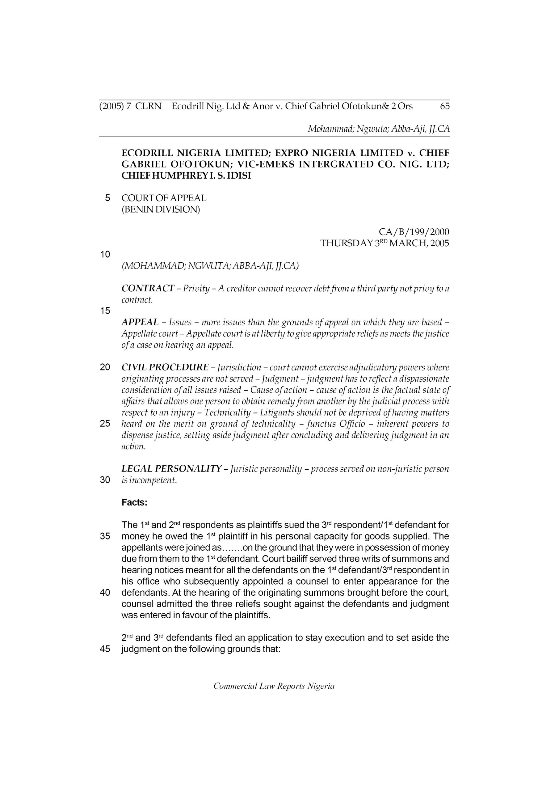 The 1st and 2nd respondents as plaintiffs sued the 3rd respondent/1st defendant for money he owed the 1st plaintiff in his personal capacity for goods supplied. The appellants were joined as…on the ground that they were in possession of money due from them to the 1st defendant. Court bailiff served three writs of summons and hearing notices meant for all the defendants on the 1st defendant/3rd respondent in his office who subsequently appointed a counsel to enter appearance for the defendants. At the hearing of the originating summons brought before the court, counsel admitted the three reliefs sought against the defendants and judgment was entered in favour of the plaintiffs.