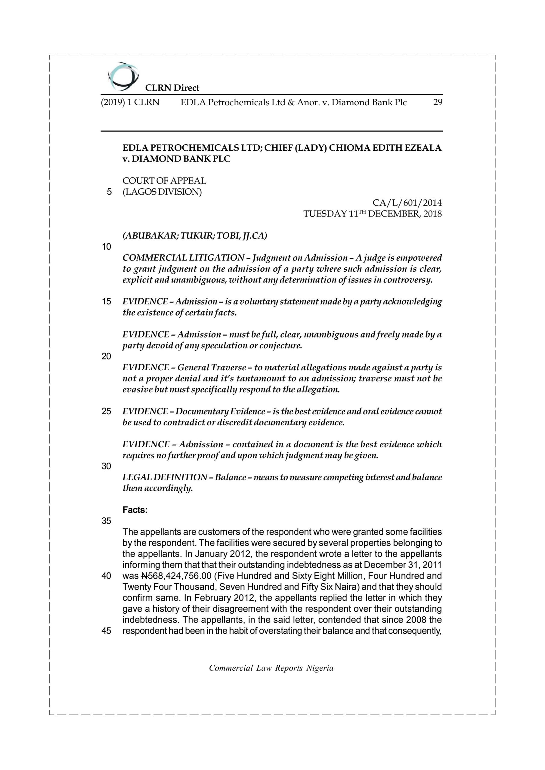 The respondent filed its defence and a counterclaim and the matter went to trial. After the pre-trial conference, the respondent filed an application for judgment on admission of the sum of N393,944,000 (Three Hundred and Ninety Three Million, Nine Hundred and Forty Four Thousand Naira) admitted by the appellants as being their outstanding indebtedness to the respondent. The appellant filed a counter affidavit in which they denied their earlier admission. After hearing the parties on the application, the court ruled in favour of the respondent and granted judgment in the amount admitted by the appellants. The appellants were dissatisfied with the decision of the trial court and filed a notice of appeal at the Court of Appeal, Lagos Division seeking orders of the court to overrule the trial court.