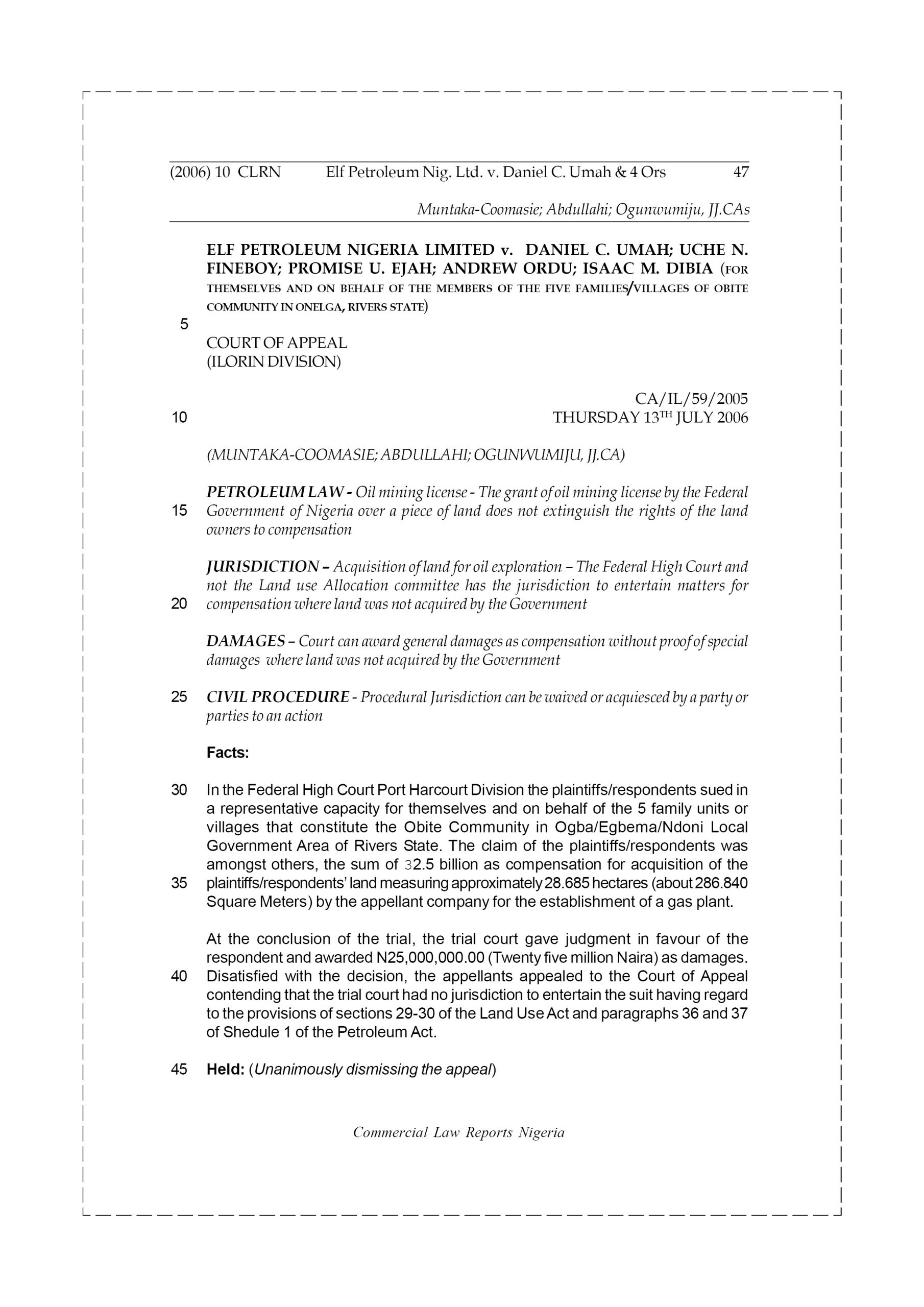 In the Federal High Court Port Harcourt Division the plaintiffs/respondents sued in a representative capacity for themselves and on behalf of the 5 family units or villages that constitute the Obite Community in Ogba/Egbema/Ndoni Local Government Area of Rivers State. The claim of the plaintiffs/respondents was amongst others, the sum of N2.5 billion as compensation for acquisition of the plaintiffs/respondents’ land measuring approximately 28.685 hectares (about 286.840 Square Meters) by the appellant company for the establishment of a gas plant.