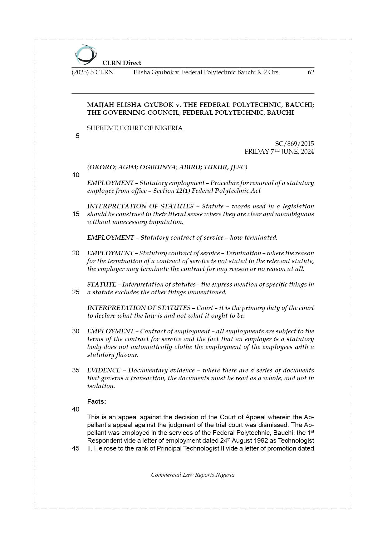 This is an appeal against the decision of the Court of Appeal wherein the Appellant’s appeal against the judgment of the trial court was dismissed. The Appellant was employed in the services of the Federal Polytechnic, Bauchi, the 1st Respondent vide a letter of employment dated 24th August 1992 as Technologist II. He rose to the rank of Principal Technologist II vide a letter of promotion dated 11th November 2002.