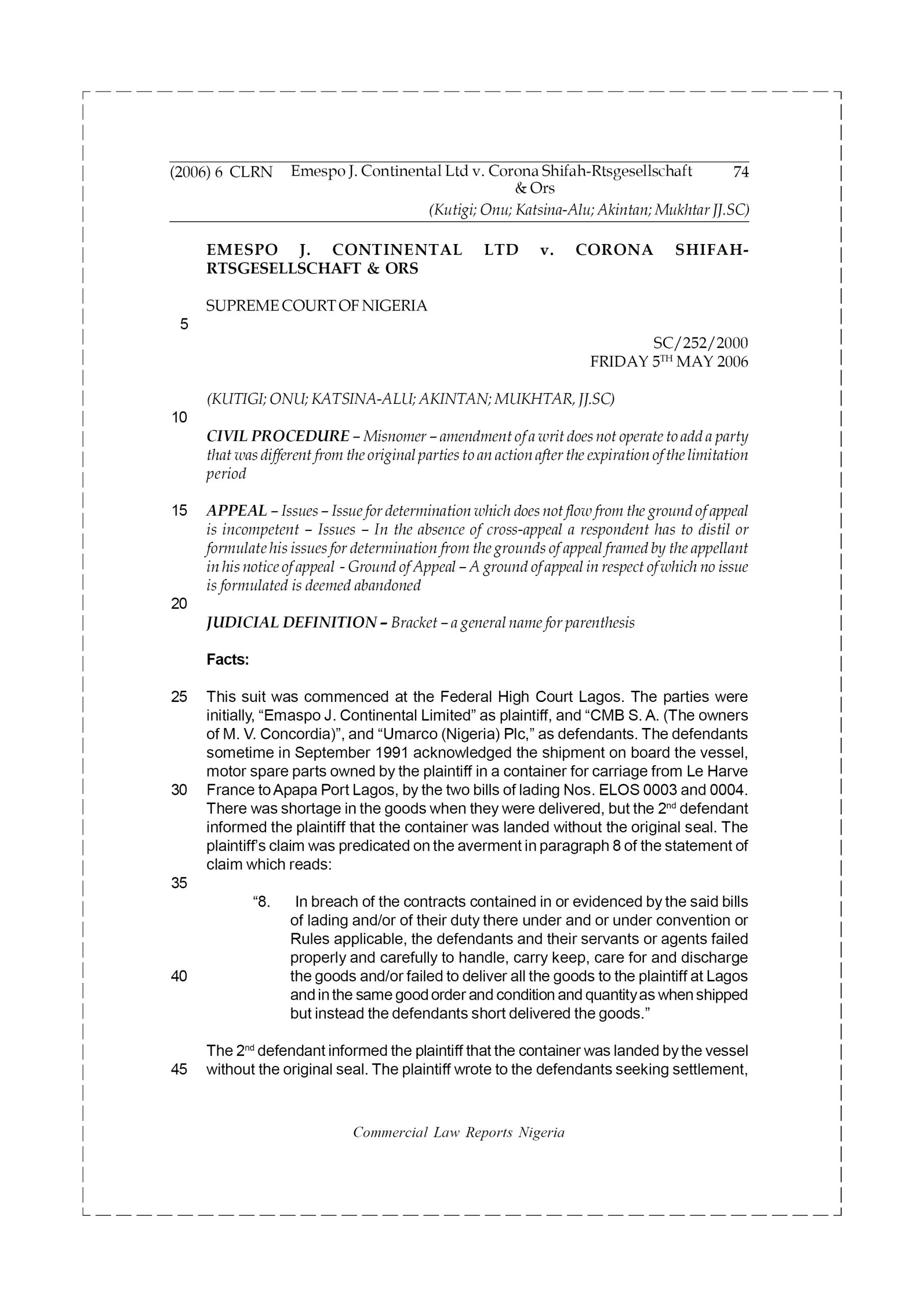 Mr. Adelekan (‘the appellant’) entered into a contract with a shipping line ECU Line NV (‘the respondent’) for the carriage by sea of photo processing machines. One voyage was from Canada to Nigeria the other was from Belgium to Nigeria. The goods were put on board the “M.V. KAGORO”. There was a discrepancy on the bill of lading that revealed that the goods were improperly described. When the MV KAGARO arrived Nigeria one of the machines was missing.