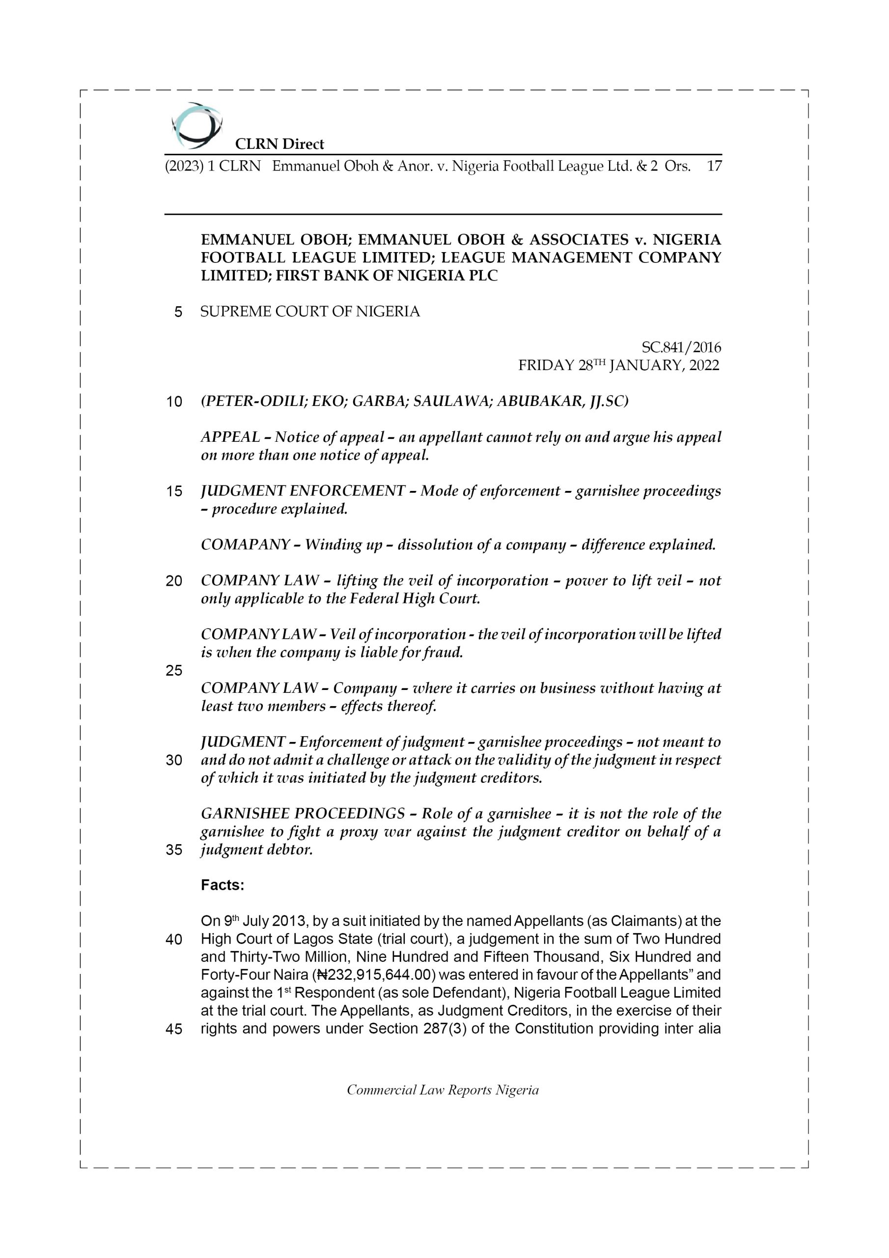 On 9th July 2013, by a suit initiated by the named Appellants (as Claimants) at the High Court of Lagos State (trial court), a judgement in the sum of Two Hundred and Thirty-Two Million, Nine Hundred and Fifteen Thousand, Six Hundred and Forty-Four Naira (₦232,915,644.00) was entered in favour of the Appellants” and against the 1st Respondent (as sole Defendant), Nigeria Football League Limited at the trial court. The Appellants, as Judgment Creditors, in the exercise of their rights and powers under Section 287(3) of the Constitution providing inter alia that the decision of a High Court shall be enforced in any part of the Federation by all authorities and persons and the Court itself, proceeded by way of garnishee proceedings at the trial court to enforce the judgment dated 9th July 2013.