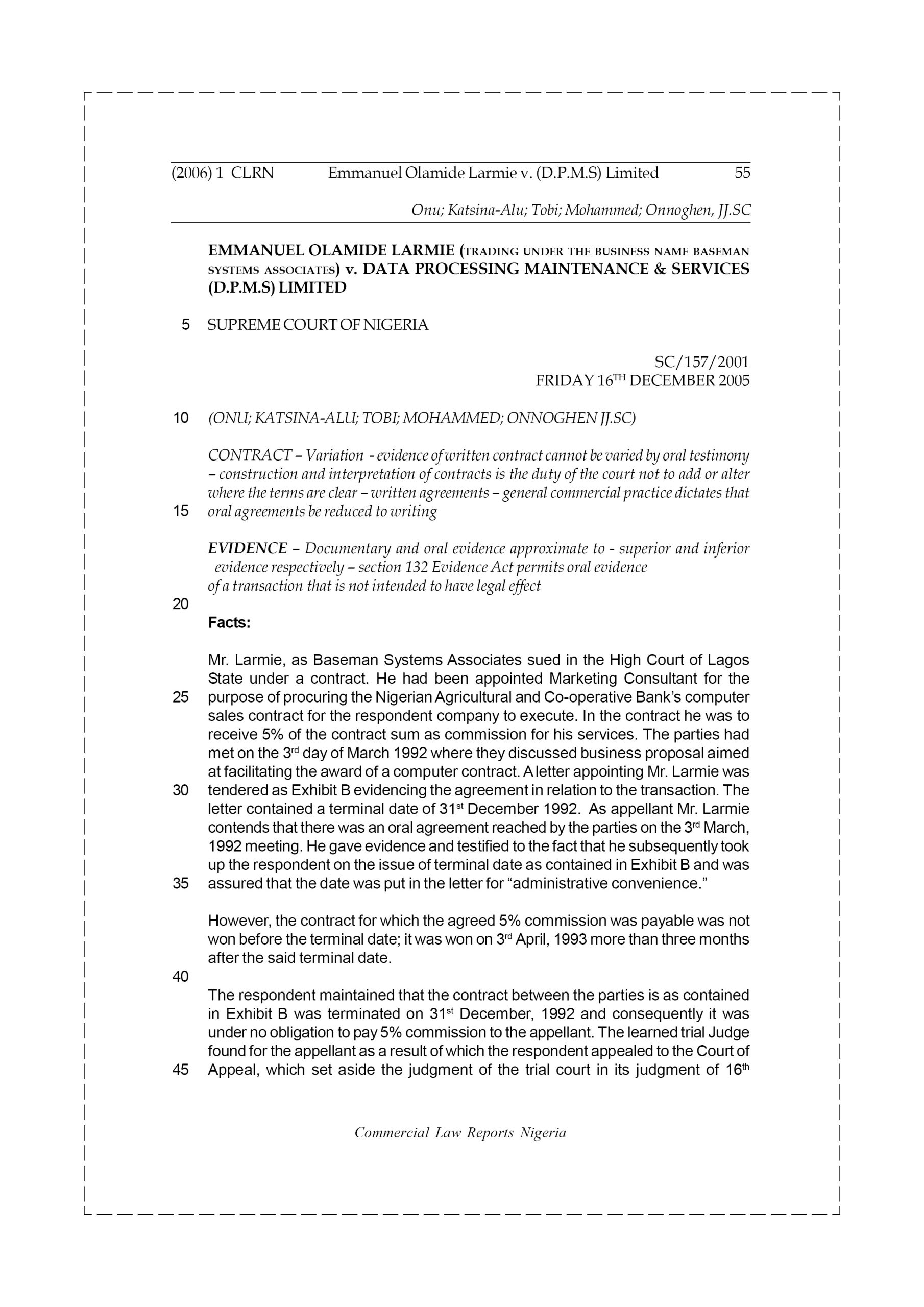Mr. Larmie, as Baseman Systems Associates sued in the High Court of Lagos State under a contract. He had been appointed Marketing Consultant for the purpose of procuring the Nigerian Agricultural and Co-operative Bank’s computer sales contract for the respondent company to execute. In the contract he was to receive 5% of the contract sum as commission for his services. The parties had met on the 3rd day of March 1992 where they discussed business proposal aimed at facilitating the award of a computer contract. A letter appointing Mr. Larmie was tendered as Exhibit B evidencing the agreement in relation to the transaction.