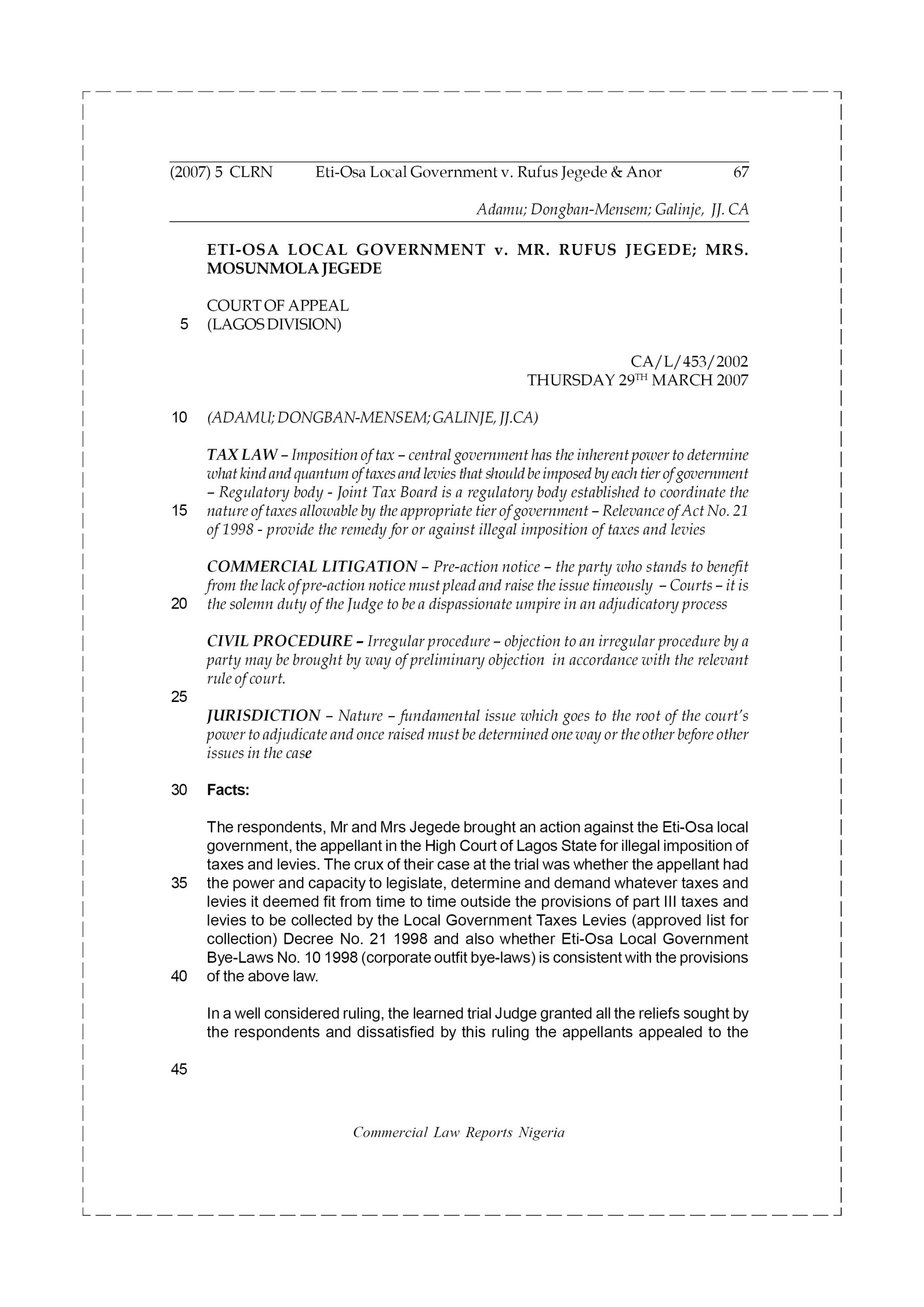 The respondents, Mr and Mrs Jegede brought an action against the Eti-Osa local government, the appellant in the High Court of Lagos State for illegal imposition of taxes and levies. The crux of their case at the trial was whether the appellant had the power and capacity to legislate, determine and demand whatever taxes and levies it deemed fit from time to time outside the provisions of part III taxes and levies to be collected by the Local Government Taxes Levies (approved list for collection) Decree No. 21 1998 and also whether Eti-Osa Local Government Bye-Laws No. 10 1998 (corporate outfit bye-laws) is consistent with the provisions of the above law.