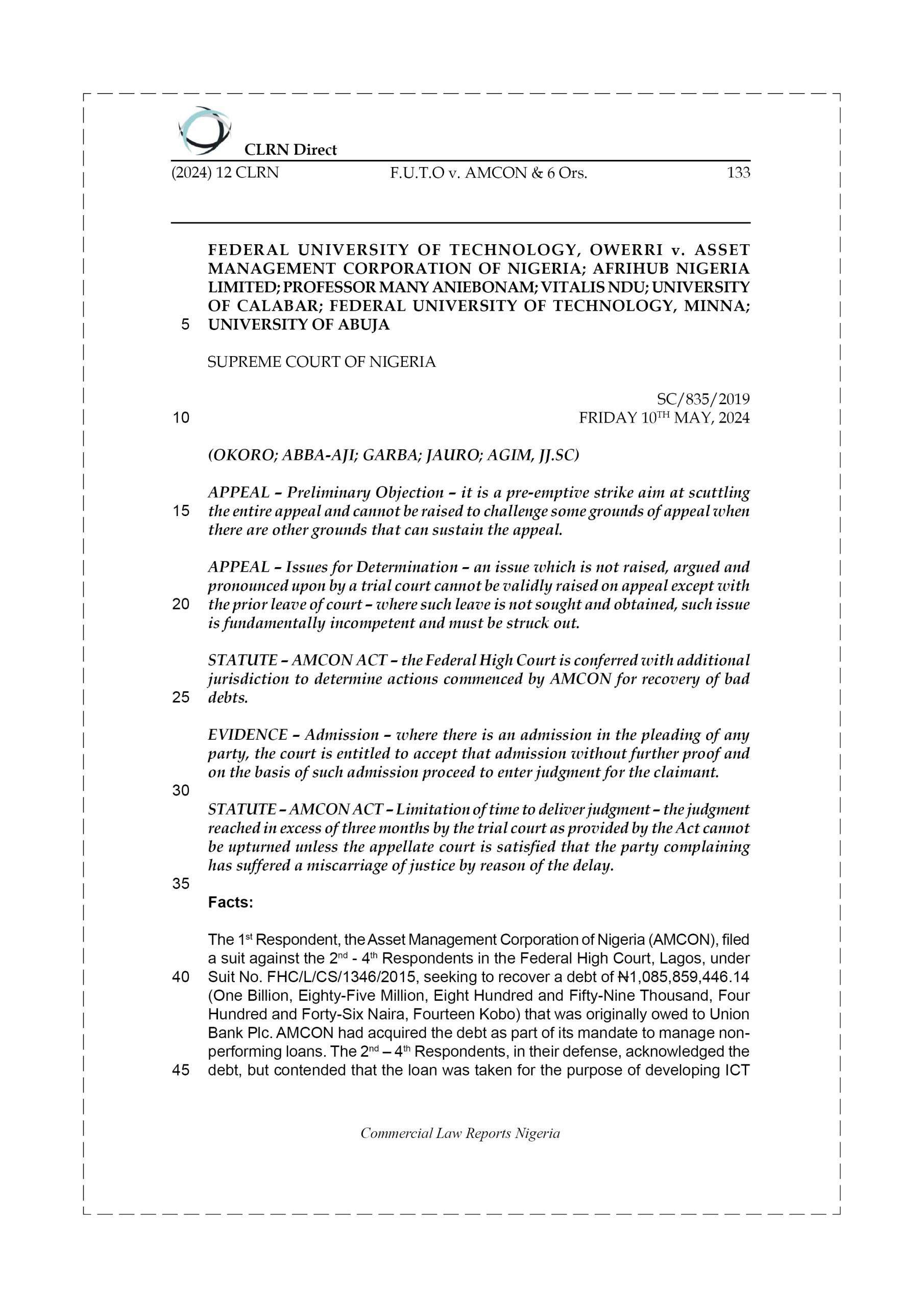 The 1st Respondent, the Asset Management Corporation of Nigeria (AMCON), fi led a suit against the 2nd – 4th Respondents in the Federal High Court, Lagos, under Suit No. FHC/L/CS/1346/2015, seeking to recover a debt of N1,085,859,446.14 (One Billion, Eighty-Five Million, Eight Hundred and Fifty-Nine Thousand, Four Hundred and Forty-Six Naira, Fourteen Kobo) that was originally owed to Union Bank Plc. AMCON had acquired the debt as part of its mandate to manage non performing loans. The 2nd – 4th Respondents, in their defense, acknowledged the debt, but contended that the loan was taken for the purpose of developing ICT hubs and training students in seven Nigerian universities, including the Appellant (a Nigerian university). The loan was to be serviced through ICT levies to be paid by the universities involved. The trial court granted the 2nd – 4th Respondents leave to issue a third-party notice on the Appellant and other related parties. As a result, the Appellant, along with other third parties, was joined in the proceedings. The 2nd – 4th Respondents subsequently fi led an application for summary judgment on 30th June 2016, seeking judgment against the Appellant in the sum of N811,080,521.00 (Eight Hundred and Eleven Million, Eighty Thousand, Five Hundred and Twenty One Naira), arguing that the Appellant had not disputed its liability for the debt and had failed to actively engage in the defense of the claim. The Appellant did not file any process at the trial court in response to the Third-Party Notice.