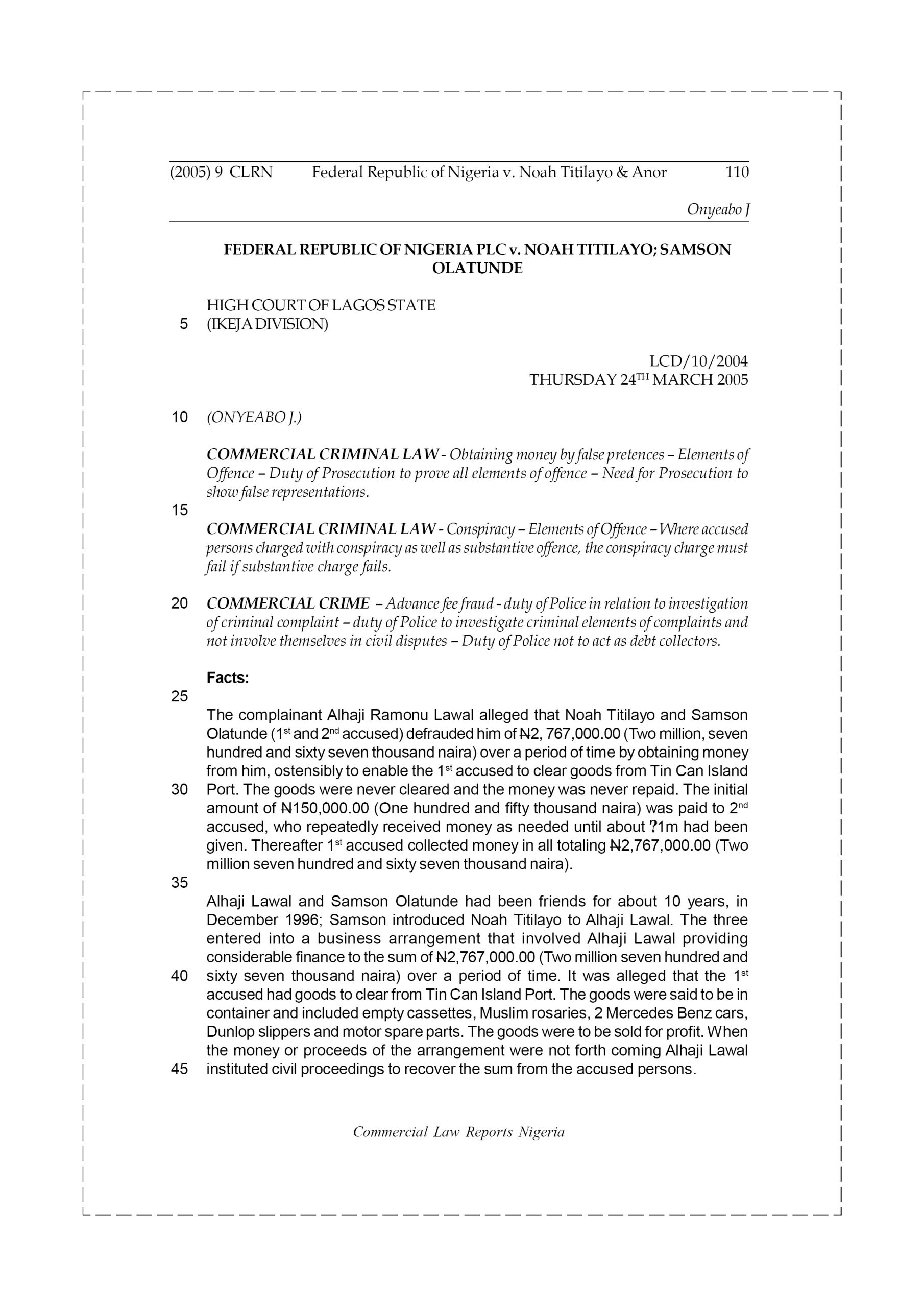 The complainant Alhaji Ramonu Lawal alleged that Noah Titilayo and Samson Olatunde (1st and 2nd accused) defrauded him of N2,767,000.00 (Two million, seven hundred and sixty seven thousand naira) over a period of time by obtaining money from him, ostensibly to enable the 1st accused to clear goods from Tin Can Island Port. The goods were never cleared and the money was never repaid. The initial amount of N150,000.00 (One hundred and fifty thousand naira) was paid to 2nd accused, who repeatedly received money as needed until about ?1m had been given. Thereafter 1st accused collected money in all totaling N2,767,000.00 (Two million seven hundred and sixty seven thousand naira).