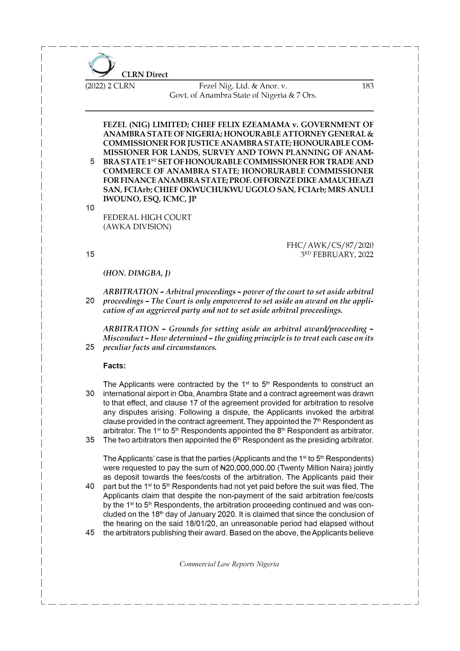 FEZEL (NIG) LIMITED & ANOR. v. GOVERNMENT OF ANAMBRA STATE OF NIGERIA & 7 ORS.